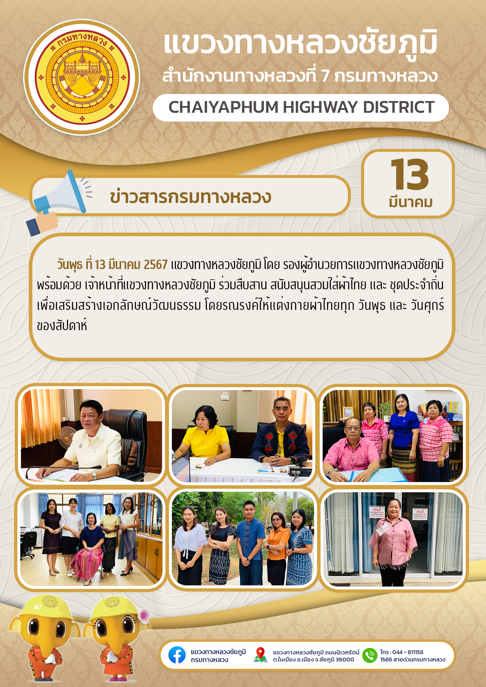 วันพุธ ที่ 13 มีนาคม 2567 แขวงทางหลวงชัยภูมิ โดย รองผู้อำนวยการแขวงทางหลวงชัยภูมิ พร้อมด้วย เจ้าหน้าที่แขวงทางหลวงชัยภูมิ ร่วมสืบสาน สนับสนุนสวมใส่ผ้าไทย และ ชุดประจำถิ่น เพื่อเสริมสร้างเอกลักษณ์วัฒนธรรม โดยรณรงค์ให้แต่งกายผ้าไทยทุก วันพุธ และ วันศุกร์ ของสัปดาห์