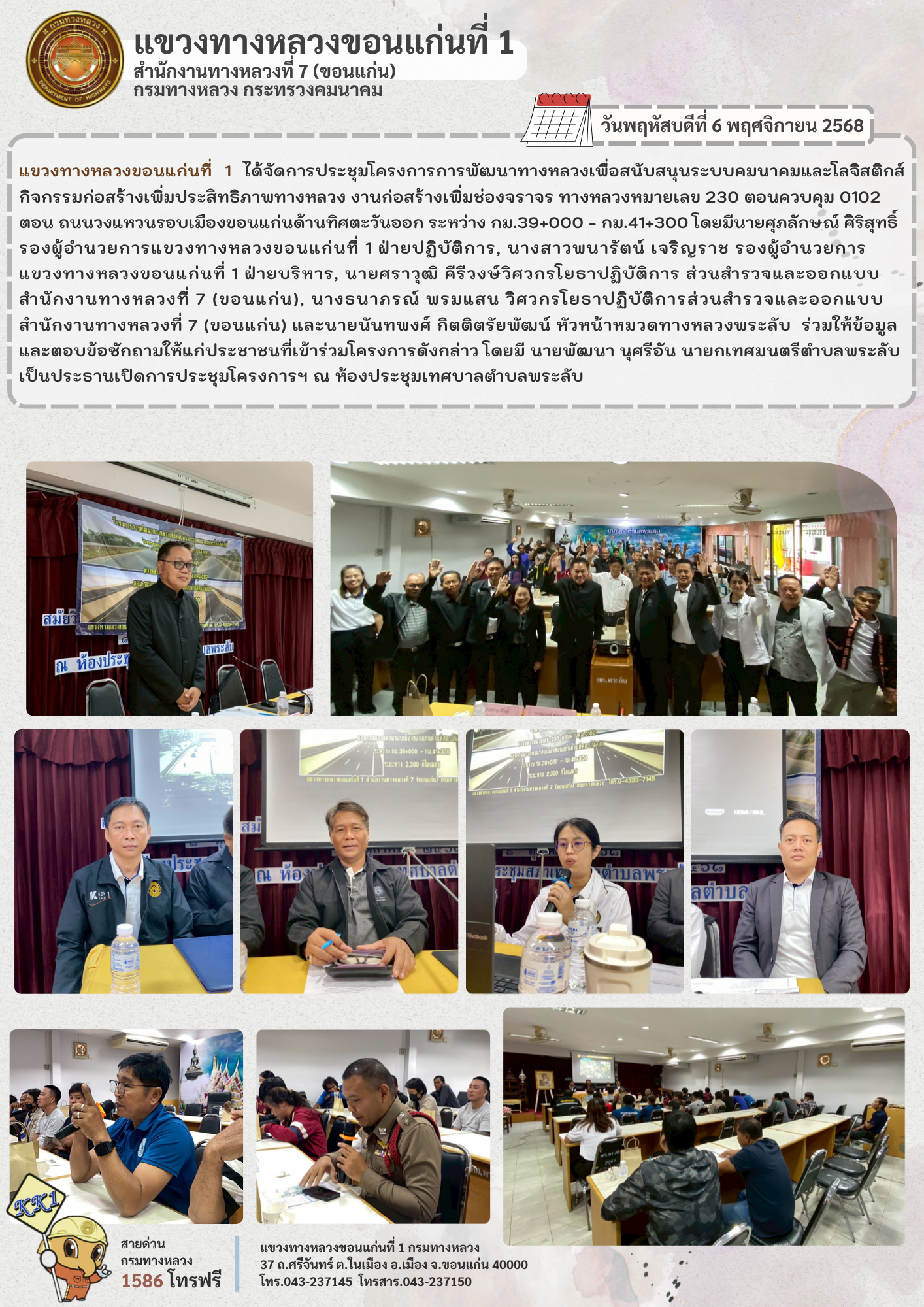 ประชุมโครงการการพัฒนาทางหลวงเพื่อสนับสนุนระบบคมนาคมและโลจิสติกส์ กิจกรรมก่อสร้างเพิ่มประสิทธิภาพทางหลวง งานก่อสร้างเพิ่มช่องจราจร ทางหลวงหมายเลข 230 ตอนควบคุม 0102 ตอน ถนนวงแหวนรอบเมืองขอนแก่นด้านทิศตะวันออก ระหว่าง กม.39+000 - กม.41+300