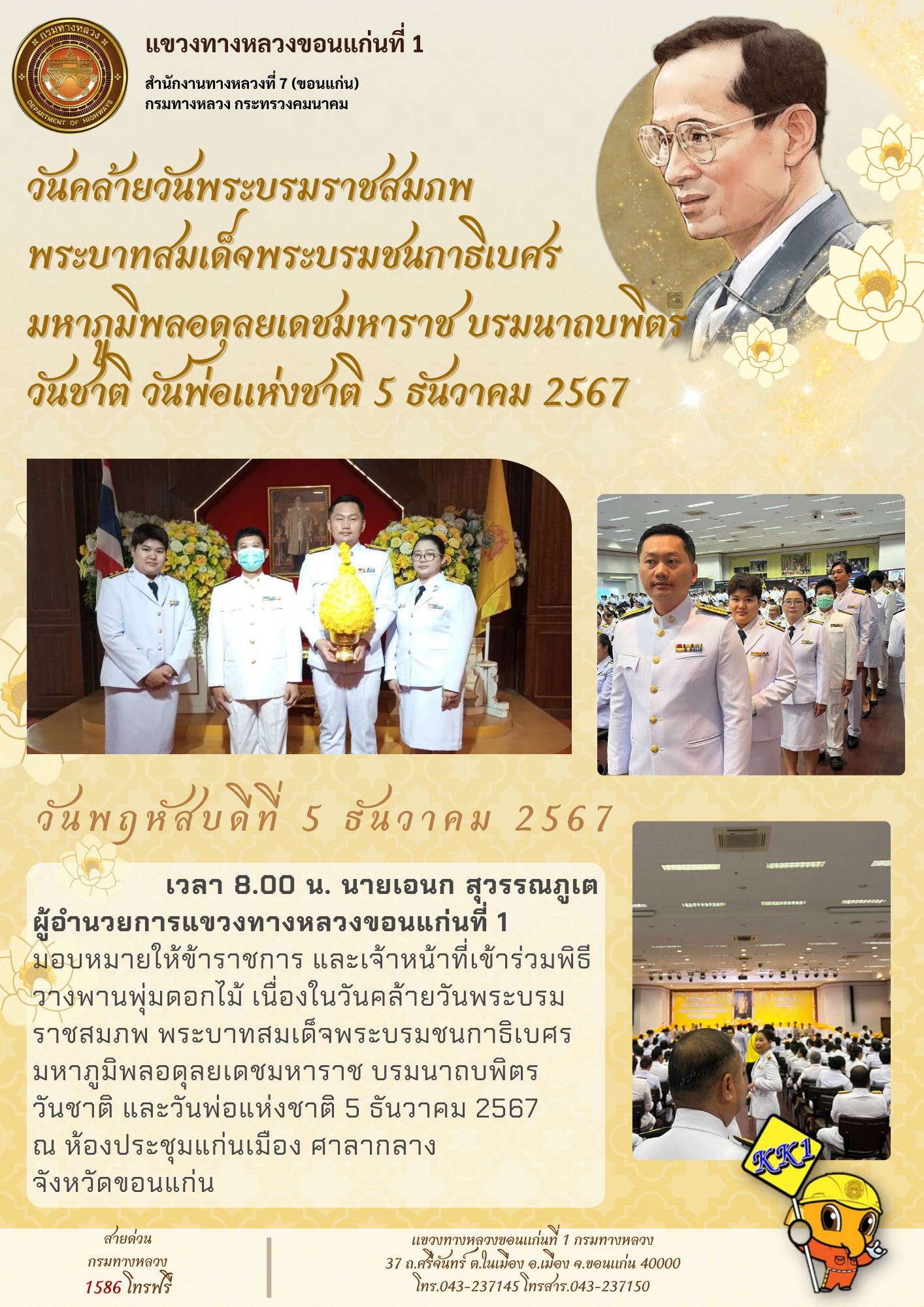 นายอภิรัฐ ไชยวงศ์น้อย อธิบดีกรมทางหลวง พร้อมคณะ ลงพื้นที่สำนักงานทางหลวงที่ 7 (ขอนแก่น) เพื่อตรวจเยี่ยมและสร้างขวัญกำลังใจแก่เจ้าหน้าที่ผู้ปฏิบัติงาน โดยได้รับฟังการบรรยายสรุปผลการดำเนินงาน ปัญหา อุปสรรค และแผนการดำเนินงานในอนาคต รวมถึงการเตรียมความพร้อมมาตรการอำนวยความปลอดภัยและอำนวยความสะดวกแก่ประชาชนในช่วงเทศกาลปีใหม่ พ.ศ. 2568