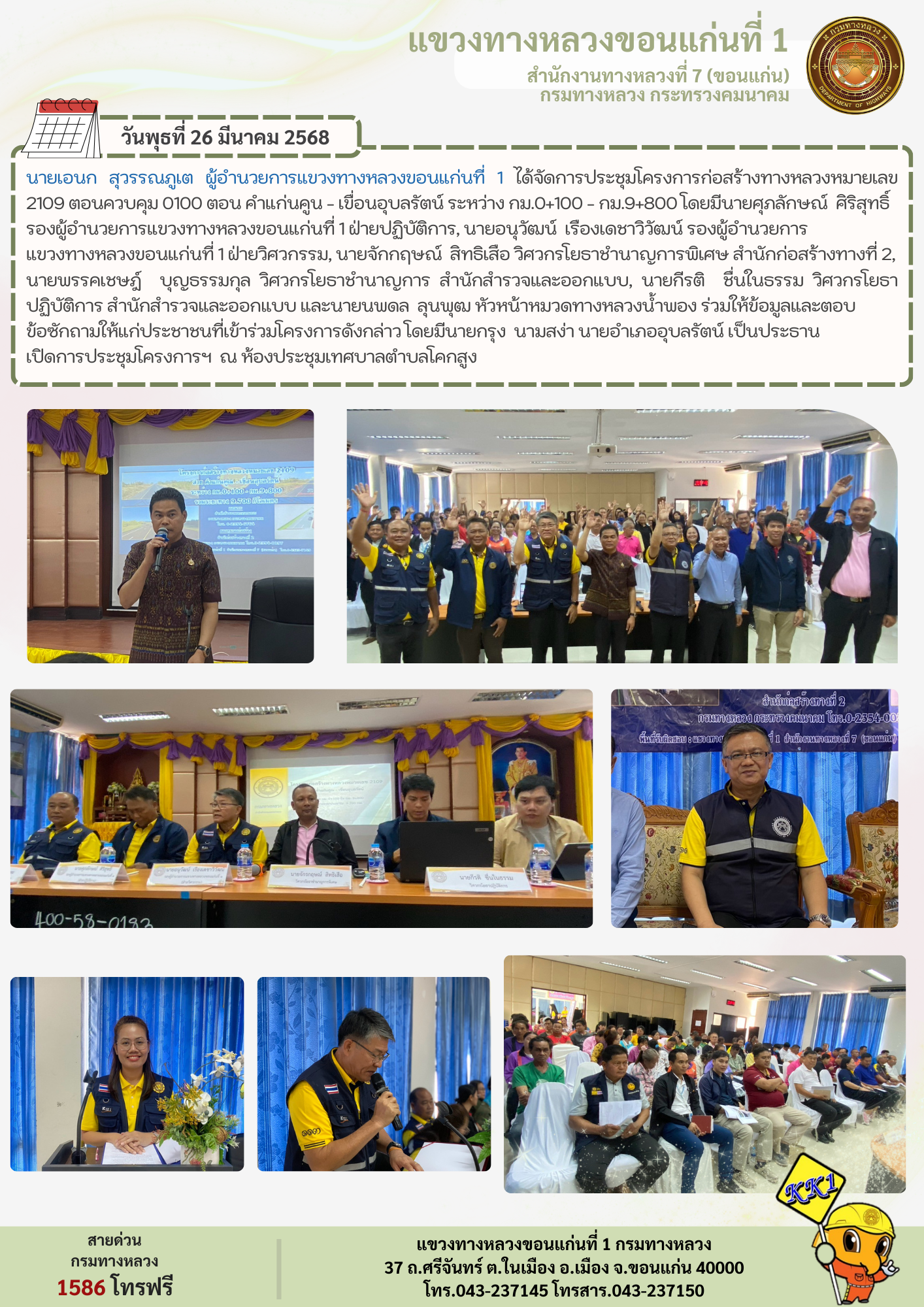 ประชุมโครงการก่อสร้างทางหลวงหมายเลข 2109 ตอนควบคุม 0100 ตอน คำแก่นคูน - เขื่อนอุบลรัตน์ ระหว่าง กม.0+100 - กม.9+800