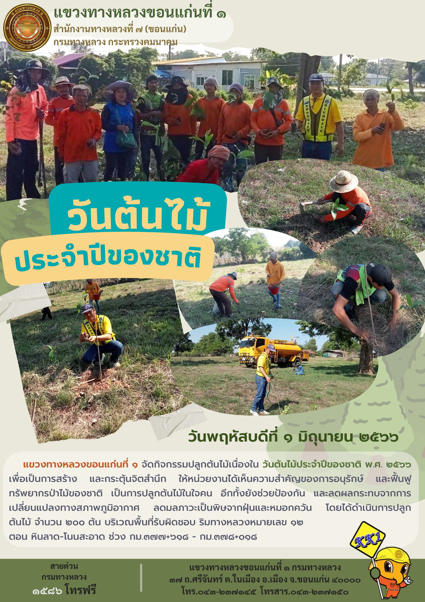 แขวงทางหลวงขอนแก่นที่ 1 จัดกิจกรรมปลูกต้นไม้เนื่องใน วันต้นไม้ประจำปีของชาติ พ.ศ. 2566 เพื่อเป็นการสร้าง และกระตุ้นจิตสำนึก ให้หน่วยงานได้เห็นความสำคัญของการอนุรักษ์ และฟื้นฟูทรัพยากรป่าไม้ของชาติ เป็นการปลูกต้นไม้ในใจคน อีกทั้งยังช่วยป้องกัน และลดผลกระทบจากการเปลี่ยนแปลงทางสภาพภูมิอากาศ ลดมลภาวะเป็นพิษจากฝุ่นและหมอกควัน โดยได้ดำเนินการปลูกต้นไม้ จำนวน 200 ต้น บริเวณพื้นที่รับผิดชอบ ริมทางหลวงหมายเลข 12 ตอน หินลาด-โนนสะอาด ช่วง กม.377+618 - กม.378+018