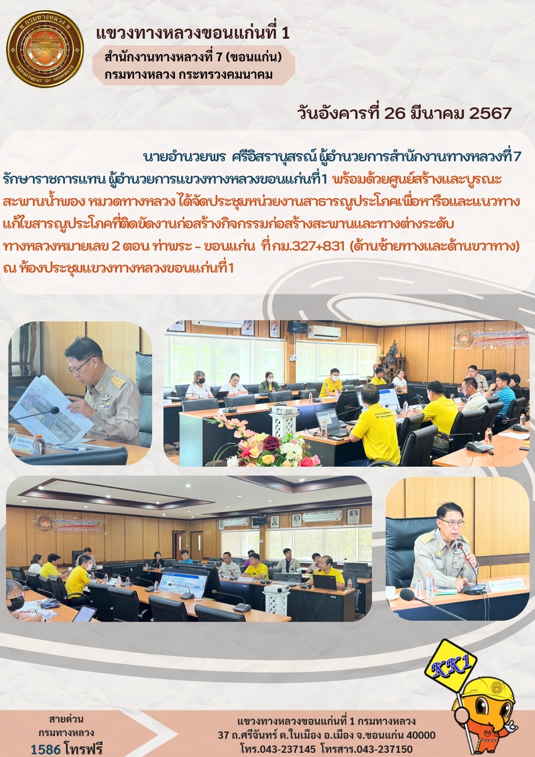 นายอำนวยพร ศรีอิสรานุสรณ์ ผู้อำนวยการสำนักงานทางหลวงที่ 7 รักษาราชการแทน ผู้อำนวยการแขวงทางหลวงขอนแก่นที่ 1 พร้อมด้วยศูนย์สร้างและบูรณะสะพานน้ำพอง หมวดทางหลวง ได้จัดประชุมหน่วยงานสาธารณูประโภคเพื่อหารือและแนวทางแก้ไขสารณูประโภคที่ติดขัดงานก่อสร้างกิจกรรมก่อสร้างสะพานและทางต่างระดับ ทางหลวงหมายเลข 2 ตอน ท่าพระ - ขอนแก่น ที่ กม.327+831 (ด้านซ้ายทางและด้านขวาทาง) ณ ห้องประชุมแขวงทางหลวงขอนแก่นที่ 1