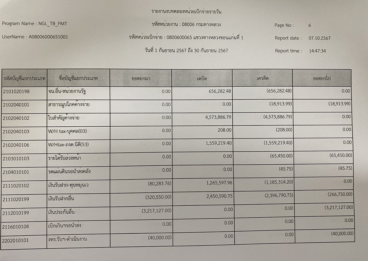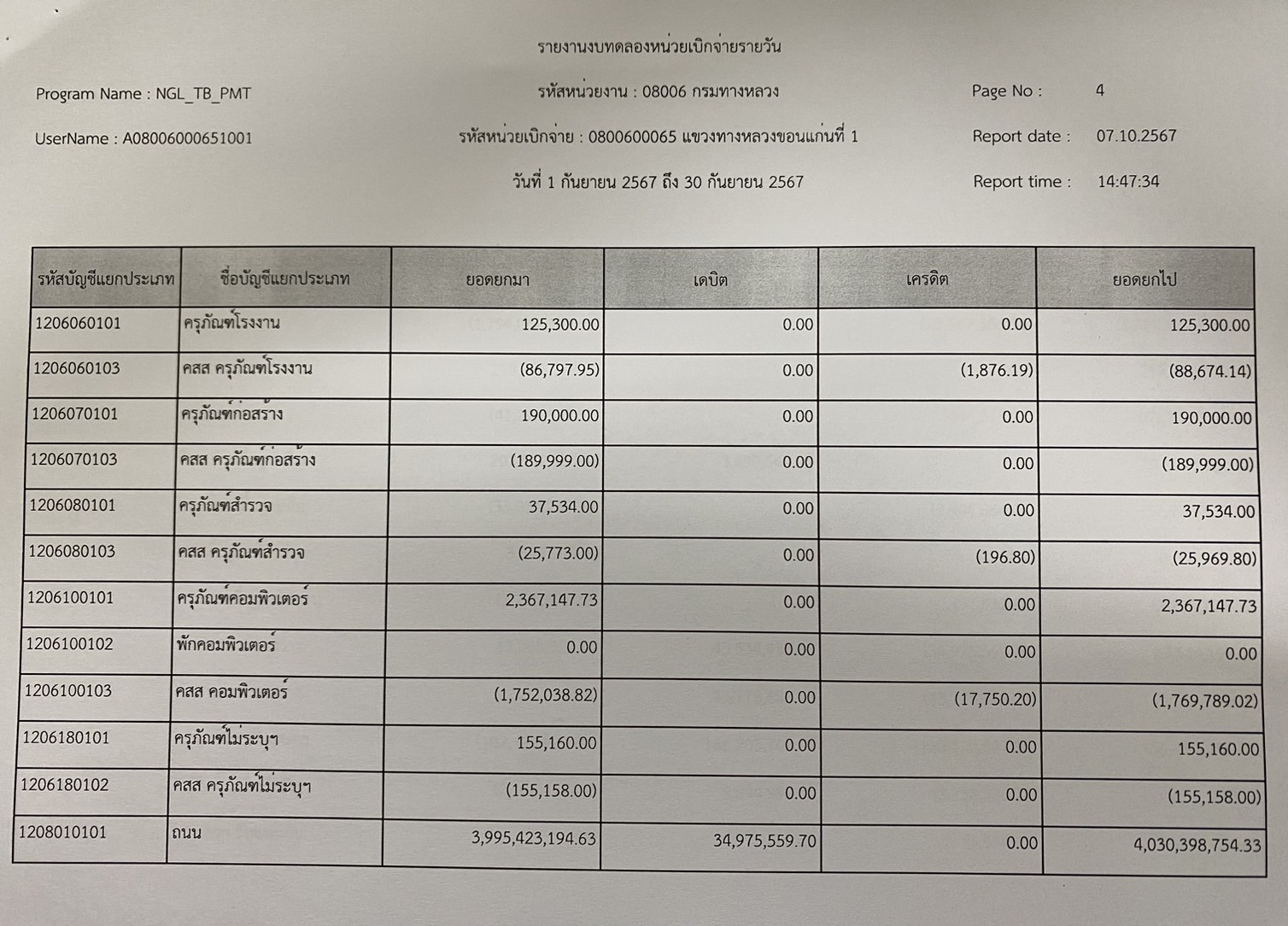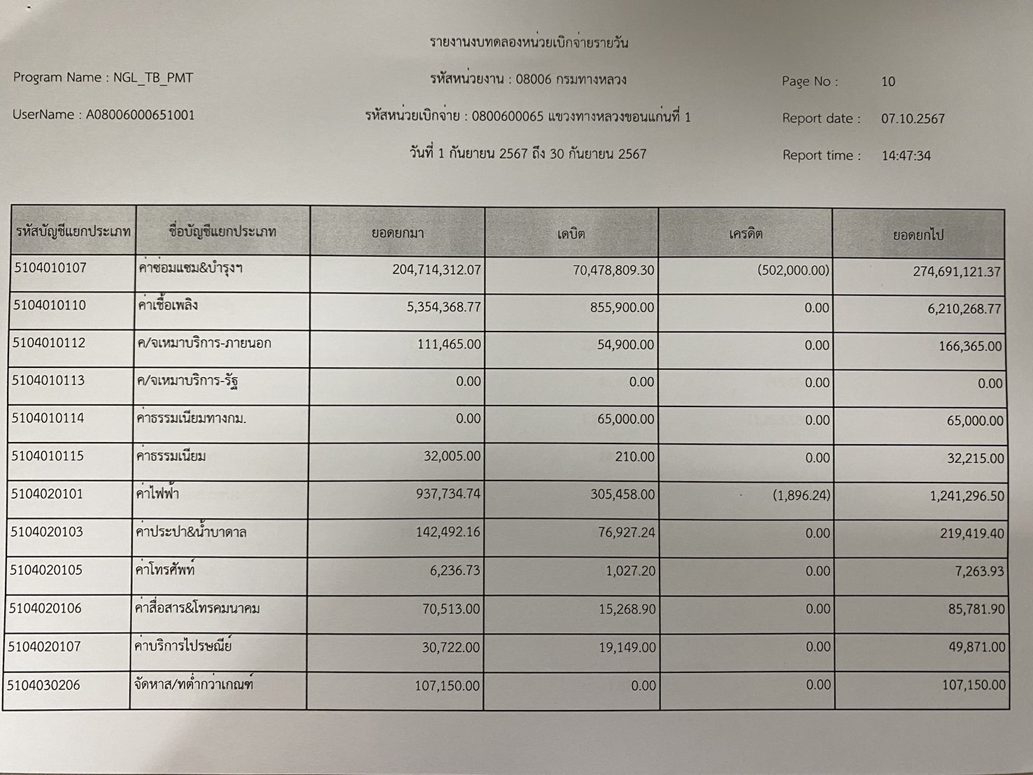 งบทดลองประจำเดือนกันยายน 2567 แขวงทางหลวงขอนแก่นที่ 1 กรมทางหลวง