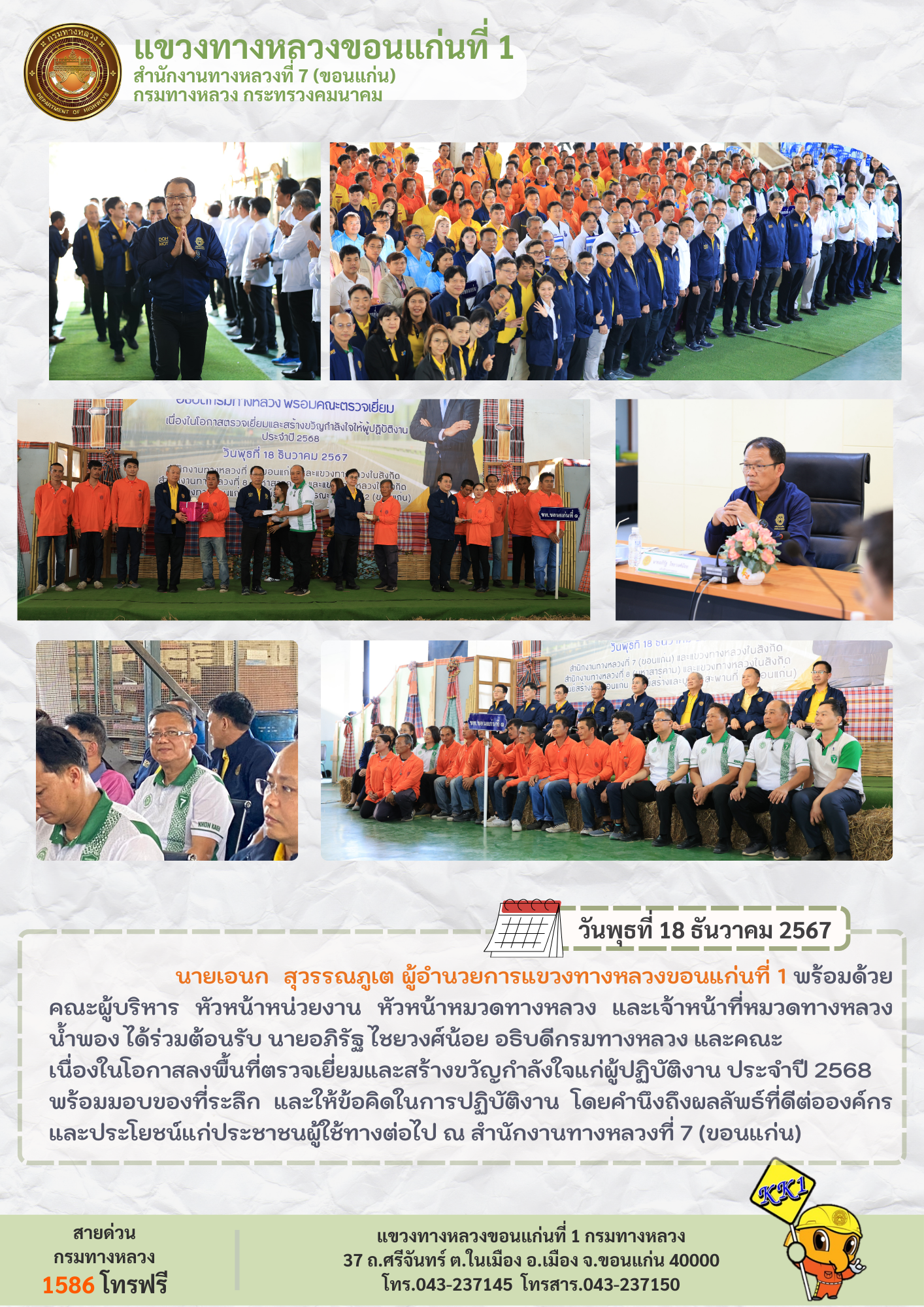 วันที่ 18 ธันวาคม 2567 นายเอนก สุวรรณภูเต ผู้อำนวยการแขวงทางหลวงขอนแก่นที่ 1 พร้อมด้วยคณะผู้บริหาร หัวหน้าหน่วยงาน หัวหน้าหมวดทางหลวง และเจ้าหน้าที่หมวดทางหลวงน้ำพอง ได้ร่วมต้อนรับ นายอภิรัฐ ไชยวงศ์น้อย อธิบดีกรมทางหลวง และคณะ เนื่องในโอกาสลงพื้นที่ตรวจเยี่ยมและสร้างขวัญกำลังใจแก่ผู้ปฏิบัติงาน ประจำปี 2568 พร้อมมอบของที่ระลึก และให้ข้อคิดในการปฏิบัติงาน โดยคำนึงถึงผลลัพธ์ที่ดีต่อองค์กรและประโยชน์แก่ประชาชนผู้ใช้ทางต่อไป ณ สำนักงานทางหลวงที่ 7 (ขอนแก่น)