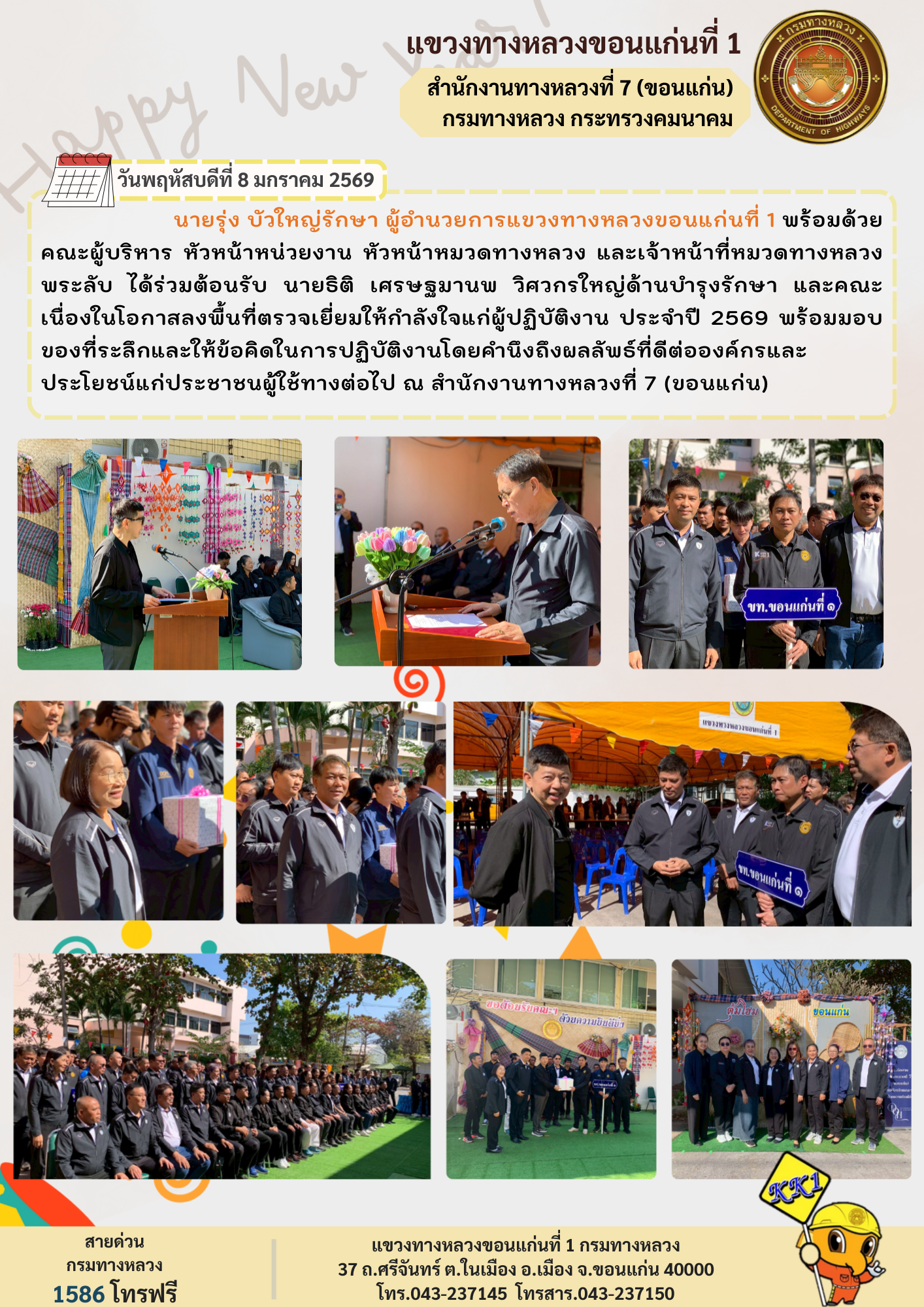 นายรุ่ง บัวใหญ่รักษา ผู้อำนวยการแขวงทางหลวงขอนแก่นที่ 1 พร้อมด้วยคณะผู้บริหาร หัวหน้าหน่วยงาน หัวหน้าหมวดทางหลวง และเจ้าหน้าที่หมวดทางหลวงพระลับ ได้ร่วมต้อนรับ นายธิติ เศรษฐมานพ วิศวกรใหญ่ด้านบำรุงรักษา และคณะ เนื่องในโอกาสลงพื้นที่ตรวจเยี่ยมให้กำลังใจแก่ผู้ปฏิบัติงาน ประจำปี 2569 พร้อมมอบของที่ระลึกและให้ข้อคิดในการปฏิบัติงานโดยคำนึงถึงผลลัพธ์ที่ดีต่อองค์กรและประโยชน์แก่ประชาชนผู้ใช้ทางต่อไป ณ สำนักงานทางหลวงที่ 7 (ขอนแก่น)