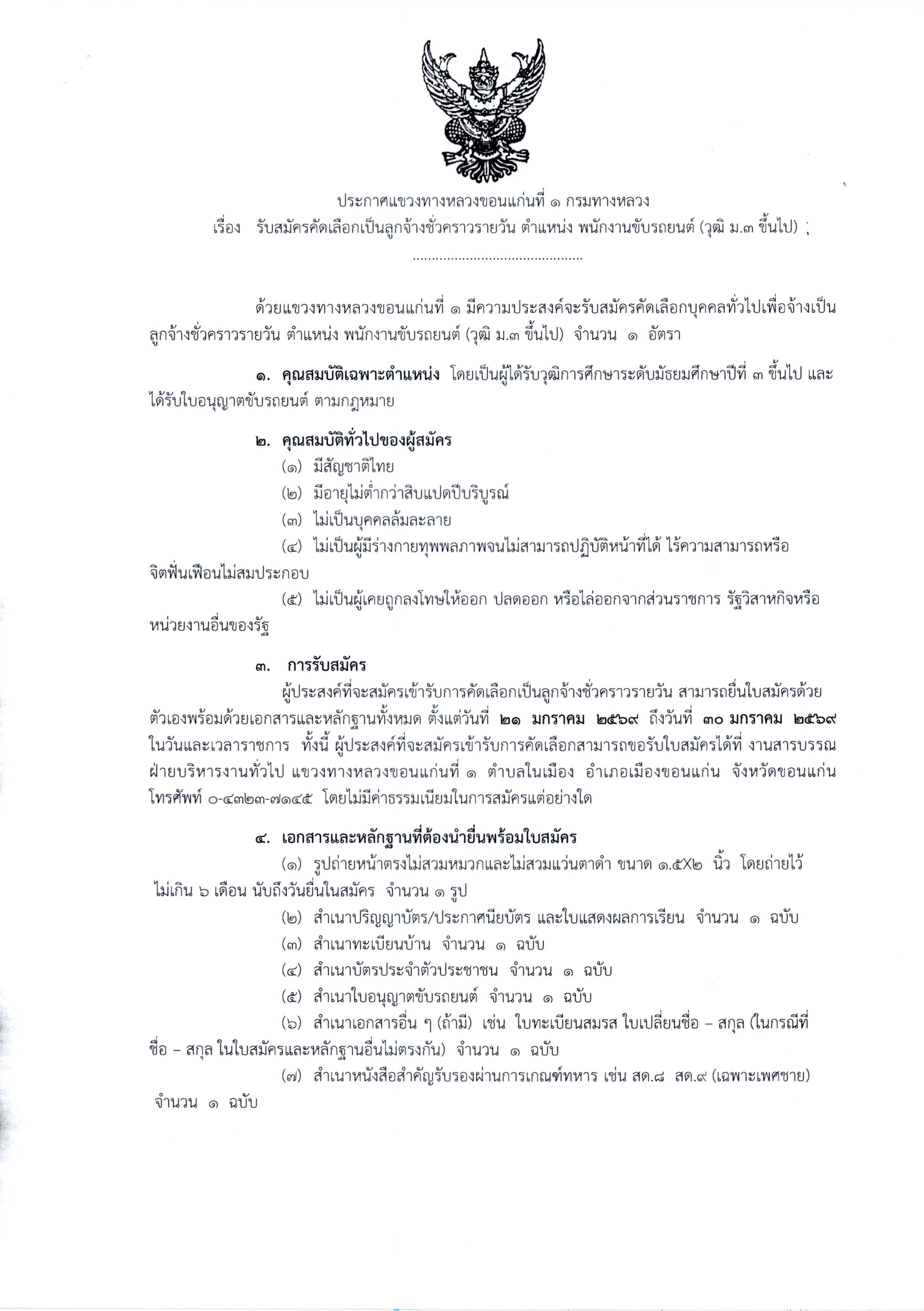 แขวงทางหลวงขอนแก่นที่ 1 รับสมัครลูกจ้างชั่วคราวรายวัน ตำแหน่งพนักงานขับรถยนต์ จำนวน 1 อัตรา