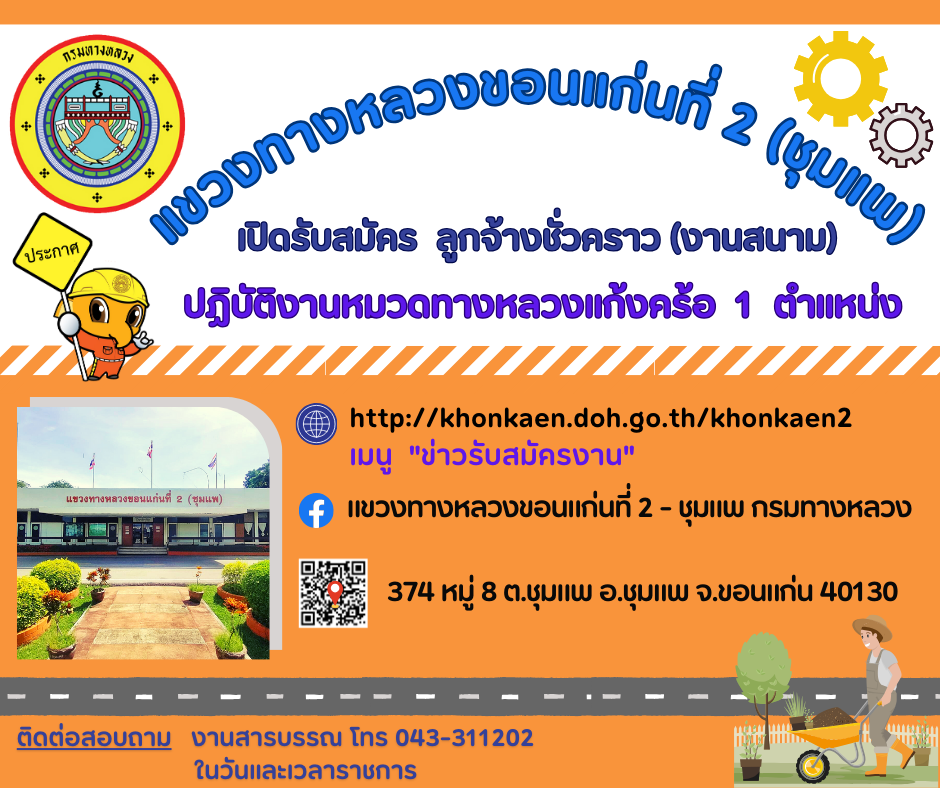 ด้วยแขวงทางหลวงขอนแก่นที่ 2 (ชุมแพ) สังกัดสำนักงานทางหลวงที่ 7 มีความประสงค์จะดำเนินการรับสมัครสอบคัดเลือกบุคคลเพื่อจ้างเป็นลูกจ้างชั่วคราวรายวัน ตำแหน่งคนงาน ปฏิบัติงานหมวดทางหลวงแก้งคร้อ จำนวน 1 ตำแหน่ง รายละเอียดตามเอกสารแนบ