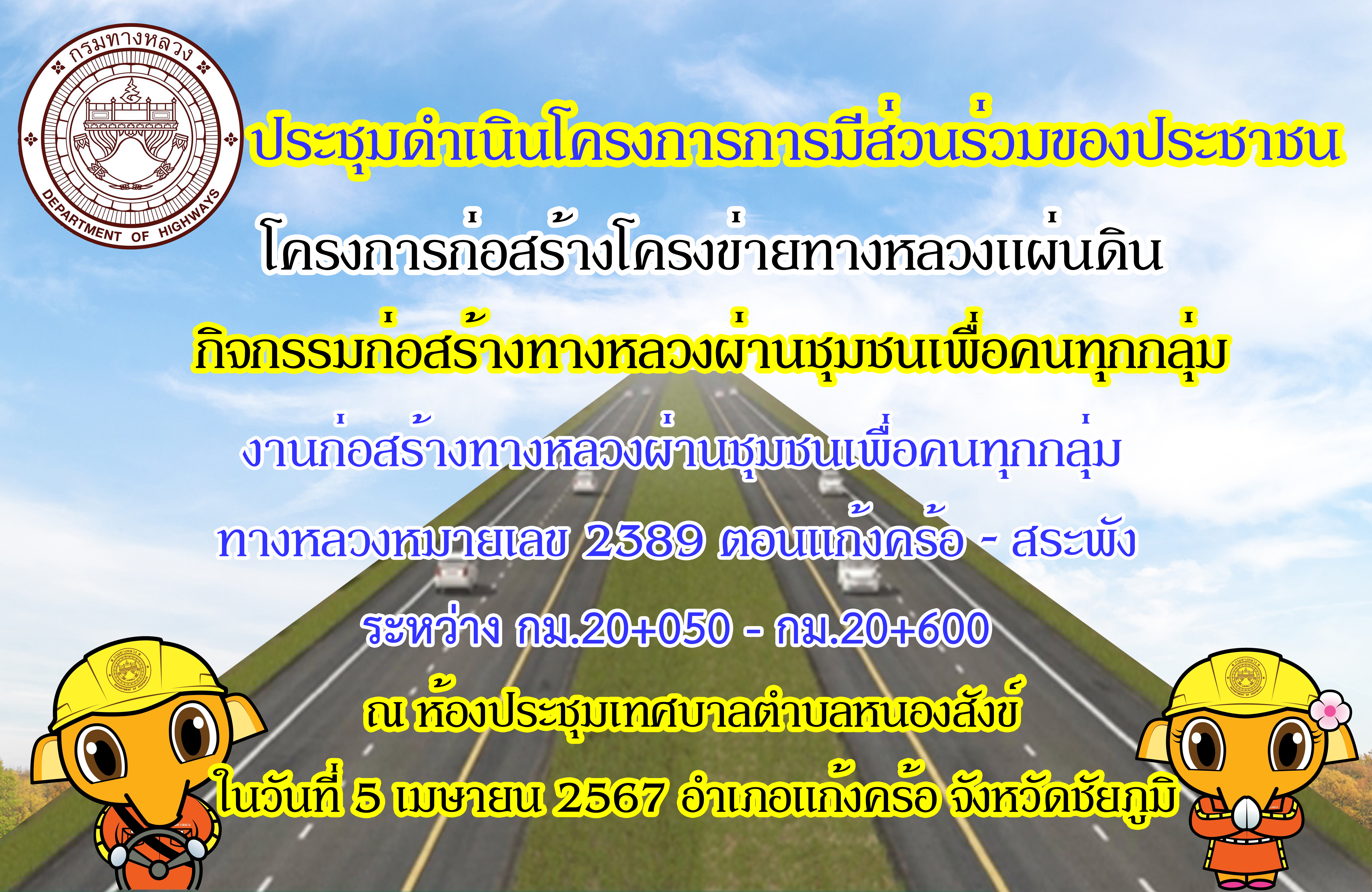 โครงการก่อสร้างโครงข่ายทางหลวงแผ่นดิน กิจกรรมก่อสร้างทางหลวงผ่านชุมชนเพื่อคนทุกกลุ่ม งานก่อสร้างทางหลวงผ่านชุมชนเพื่อคนทุกกลุ่ม ทางหลวงหมายเลข 2389 ตอน แก้งคร้อ – สระพัง ระหว่าง กม.20+050 - กม.20+600 |