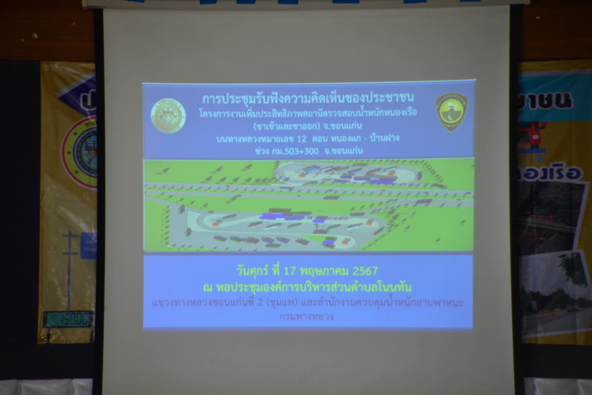 วันที่ 17 พฤษภาคม 2567 นายประสพชัย ปรางค์ทอง ผู้อำนวยการแขวงทางหลวงขอนแก่นที่ 2 (ชุมแพ) และเจ้าหน้าที่แขวงทางหลวงขอนแก่นที่ 2 (ชุมแพ) ได้ประชุมการมีส่วนร่วมของประชาชนประจำปี 2567 ร่วมกับหน่วยงานที่เกี่ยวข้องทั้งภาครัฐ ผู้นำท้องถิ่น ผู้นำชุมชน และประชาชนในพื้นที่โครงการ “โครงการงานเพิ่มประสิทธิภาพสถานีตรวจสอบน้ำหนักหนองเรือ (ขาเข้าและขาออก) จ.ขอนแก่น บนทางหลวงหมายเลข 12 ตอน หนองแก - บ้านฝาง ช่วง กม.503+300“ และมีนายอาทิตย์ พุทธสิมมา วิศวกรโยธาชำนาญการพิเศษ สำนักงานควบคุมน้ำหนักยานพาหนะ กรมทางหลวง เป็นวิทยากรนำเสนอรายละเอียดรูปแบบของโครงการ ตลอดจนเปิดโอกาสให้ประชาชนได้ร่วมแสดงความคิดเห็น ข้อเสนอแนะต่างๆ อันจะเป็นประโยชน์ต่อการดำเนินโครงการ ซึ่งในที่ประชุมมีมติเห็นด้วยกับโครงการก่อสร้างดังกล่าว