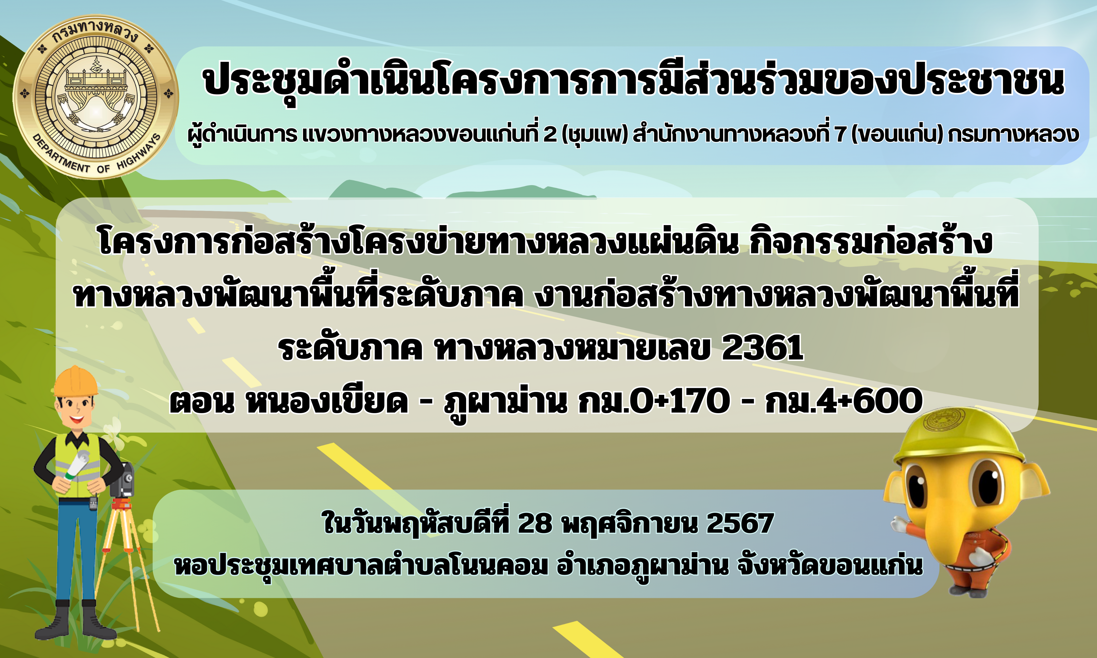 โครงการก่อสร้างโครงข่ายทางหลวงแผ่นดิน กิจกรรมก่อสร้างทางหลวงพัฒนาพื้นที่ระดับภาค งานก่อสร้างทางหลวงพัฒนาพื้นที่ระดับภาค ทล. 2361 ตอน หนองเขียด - ภูผาม่าน กม.0+170 - กม.4+600 |