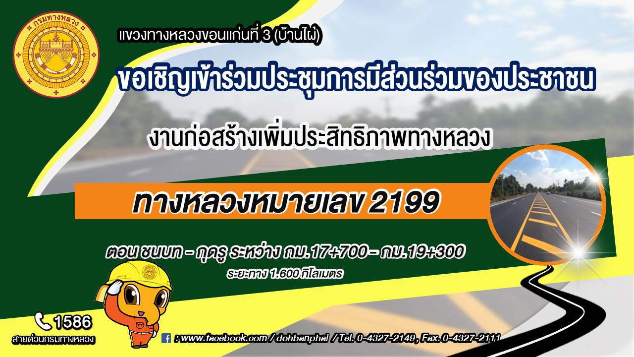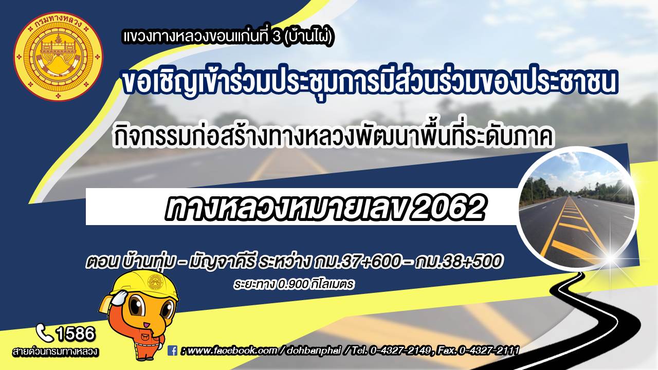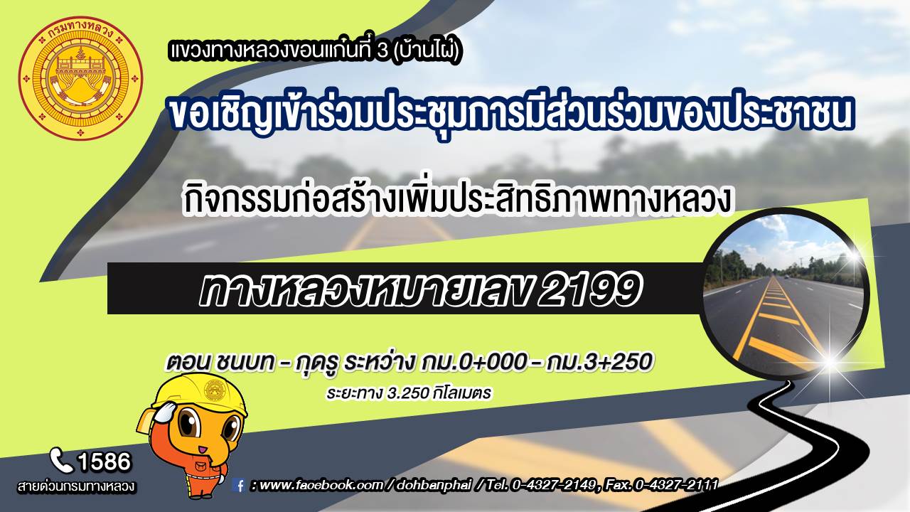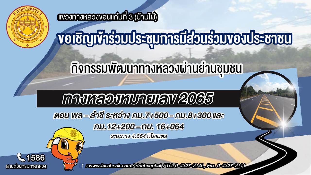 ด้วยแขวงทางหลวงขอนแก่นที่ 3 (บ้านไผ่) กรมทางหลวง ได้รับการจัดสรรงบประมาณปี 2565 เพื่อเพิ่มประสิทธิภาพในการรองรับปริมาณการจราจรที่เพิ่มมากขึ้น และอำนวยความสะดวกปลอดภัยแก่ผู้ใช้ทาง เพื่อให้ประชาชนในพื้นที่และประชาชนทั่วไปได้รับทราบข้อมูล เหตุผลความจำเป็น วัตถุประสงค์สาระสำคัญ สถานที่ ขั้นตอนและระยะเวลาดำเนินการ ผลผลิตและผลลัพธ์ของโครงการ และรายละเอียดอื่น ๆ เพื่อสร้างความรู้ความเข้าใจที่ถูกต้อง และเปิดโอกาสให้ทุกภาคส่วนที่เกี่ยวข้อง ได้เข้ามามีส่วนร่วมในการแสดงความคิดเห็น และข้อเสนอแนะที่เป็นประโยชน์ แขวงทางหลวงขอนแก่นที่ 3 (บ้านไผ่) กรมทางหลวง จึงขอเรียนเชิญผู้ที่สนใจเข้าร่วมประชุมการมีส่วนร่วมของประชาชน รายละเอียด ดังนี้