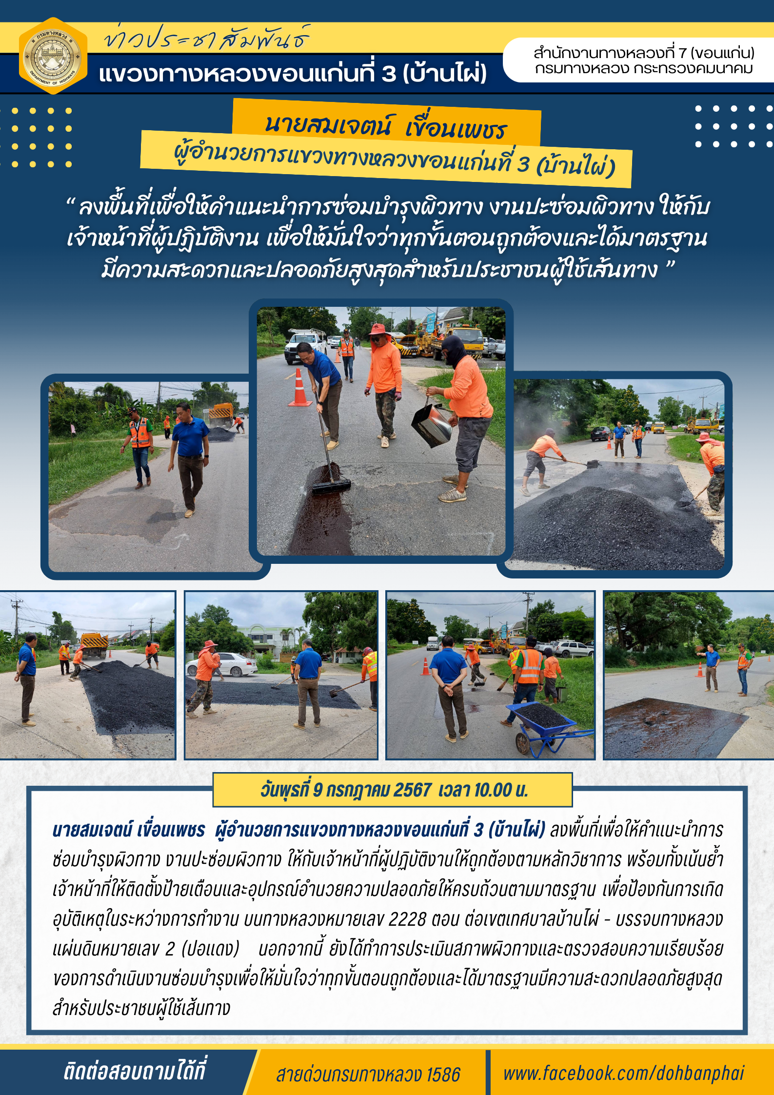 #นายสมเจตน์ เขื่อนเพชร ผู้อำนวยการแขวงทางหลวงขอนแก่นที่ 3 (บ้านไผ่) ลงพื้นที่เพื่อให้คำแนะนำการซ่อมบำรุงผิวทาง งานปะซ่อมผิวทาง ให้กับเจ้าหน้าที่ผู้ปฏิบัติงานให้ถูกต้องตามหลักวิชาการ พร้อมทั้งเน้นย้ำเจ้าหน้าที่ให้ติดตั้งป้ายเตือนและอุปกรณ์อำนวยความปลอดภัยให้ครบถ้วนตามมาตรฐาน เพื่อป้องกันการเกิดอุบัติเหตุในระหว่างการทำงาน บนทางหลวงหมายเลข 2228 ตอน ต่อเขตเทศบาลบ้านไผ่ - บรรจบทางหลวงแผ่นดินหมายเลข 2 (ปอแดง) นอกจากนี้ ยังได้ทำการประเมินสภาพผิวทางและตรวจสอบความเรียบร้อยของการดำเนินงานซ่อมบำรุงเพื่อให้มั่นใจว่าทุกขั้นตอนถูกต้องและได้มาตรฐานมีความสะดวกปลอดภัยสูงสุดสำหรับประชาชนผู้ใช้เส้นทาง