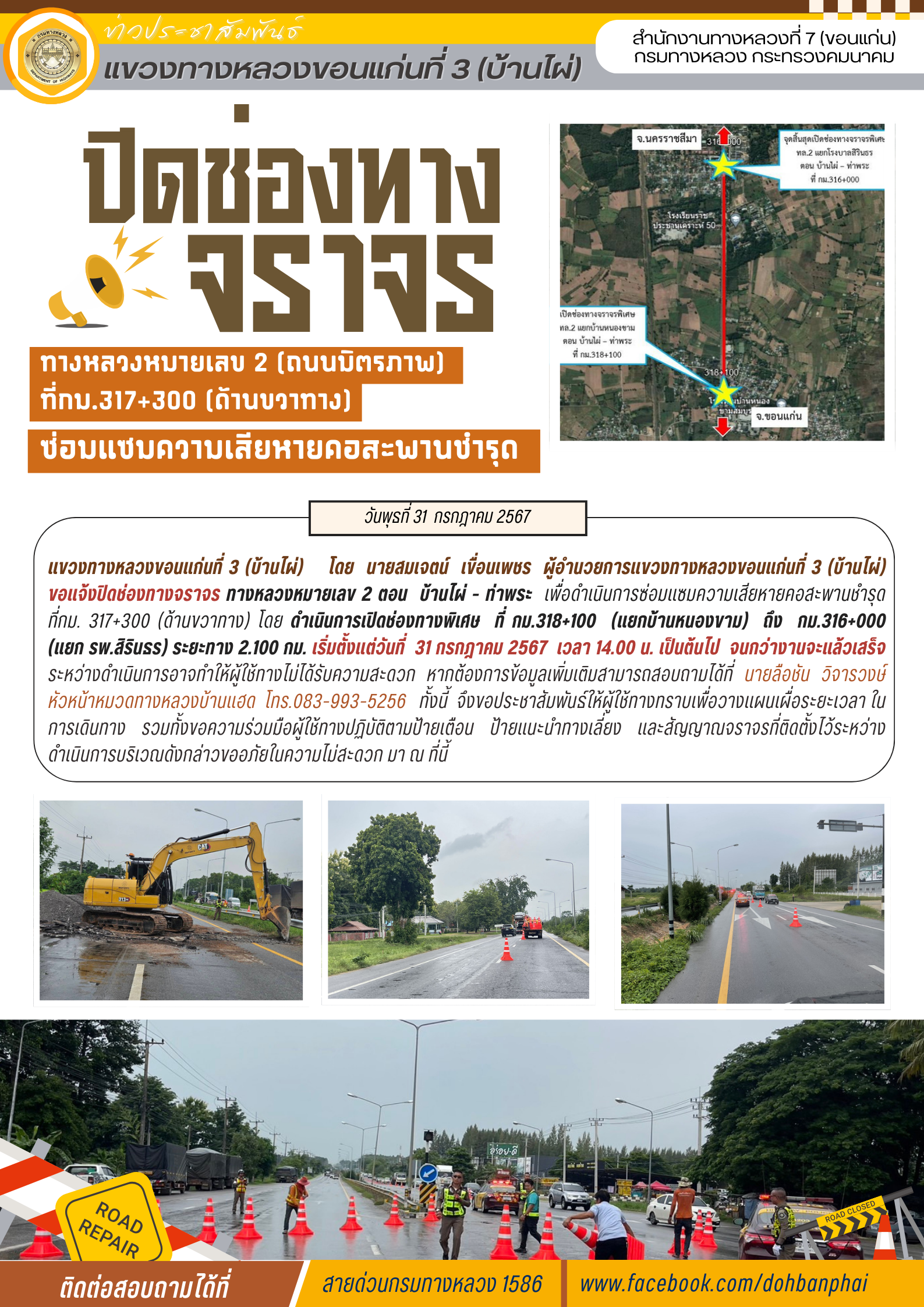 #ปิดช่องทางจราจร ทางหลวงหมายเลข 2 ตอน บ้านไผ่ - ท่าพระ เพื่อดำเนินการซ่อมแซมความเสียหายคอสะพานชำรุด ที่กม. 317+300 (ด้านขวาทาง) โดย เปิดช่องทางพิเศษ ที่ กม.318+100 (แยกบ้านหนองขาม) ถึง กม.316+000 (แยก รพ.สิรินธร) ระยะทาง 2.100 กม. เริ่มตั้งแต่วันที่ 31 กรกฎาคม 2567 เวลา 14.00 น. เป็นต้นไป จนกว่างานจะแล้วเสร็จ