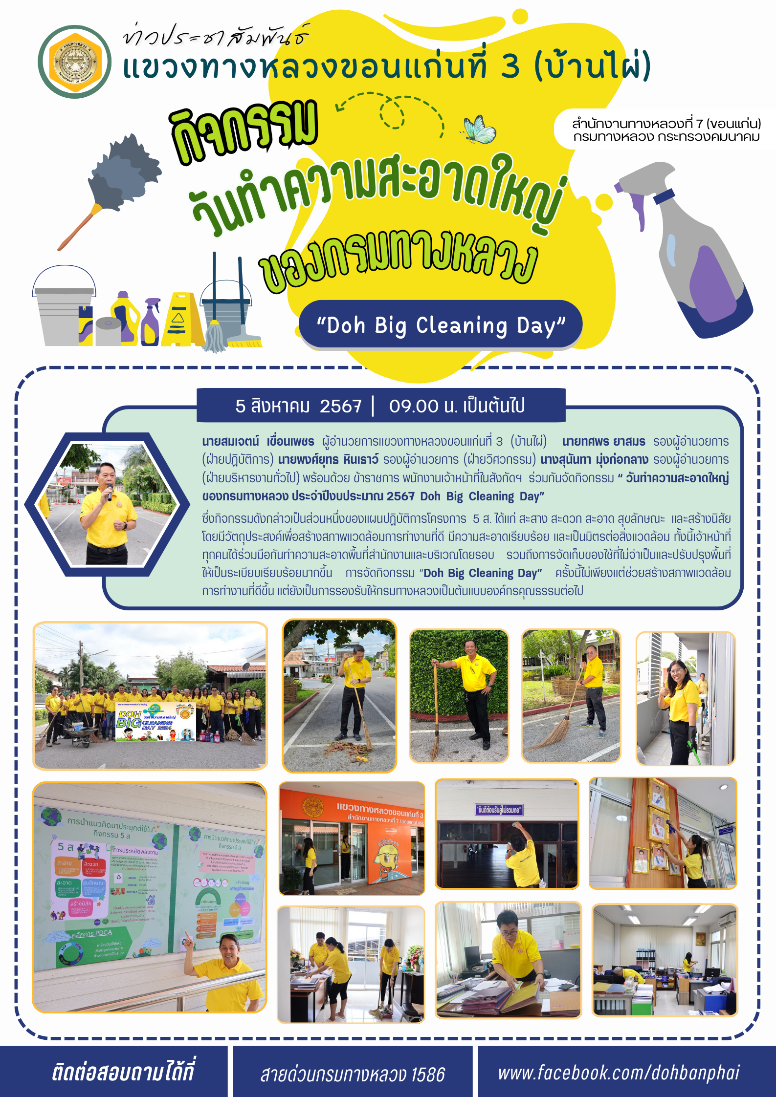 กิจกรรมดังกล่าวเป็นส่วนหนึ่งของแผนปฏิบัติการโครงการ 5 ส. ได้แก่ สะสาง สะดวก สะอาด สุขลักษณะ และสร้างนิสัย โดยมีวัตถุประสงค์เพื่อสร้างสภาพแวดล้อมการทำงานที่ดี มีความสะอาดเรียบร้อย และเป็นมิตรต่อสิ่งแวดล้อม ทั้งนี้เจ้าหน้าที่ทุกคนได้ร่วมมือกันทำความสะอาดพื้นที่สำนักงานและบริเวณโดยรอบ รวมถึงการจัดเก็บของใช้ที่ไม่จำเป็นและปรับปรุงพื้นที่ให้เป็นระเบียบเรียบร้อยมากขึ้น การจัดกิจกรรม “Doh Big Cleaning Day” ครั้งนี้ไม่เพียงแต่ช่วยสร้างสภาพแวดล้อมการทำงานที่ดีขึ้น แต่ยังเป็นการรองรับให้กรมทางหลวงเป็นต้นแบบองค์กรคุณธรรมต่อไป