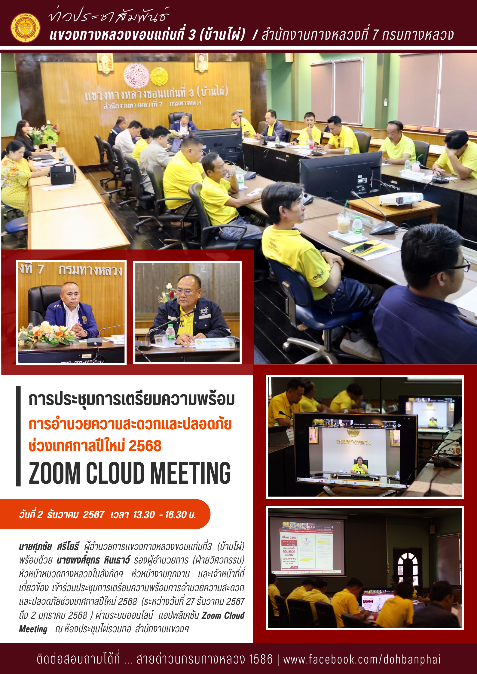 #นายศุภชัย ศรีโยธี ผู้อำนวยการแขวงทางหลวงขอนแก่นที่3 (บ้านไผ่)  พร้อมด้วย นายพงศ์ยุทธ หินเธาว์ รองผู้อำนวยการ (ฝ่ายวิศวกรรม) หัวหน้าหมวดทางหลวงในสังกัดฯ  หัวหน้างานทุกงาน  และเจ้าหน้าที่ที่เกี่ยวข้อง เข้าร่วมประชุมการเตรียมความพร้อมการอำนวยความสะดวกและปลอดภัยช่วงเทศกาลปีใหม่ 2568  (ระหว่างวันที่ 27 ธันวาคม 2567 ถึง 2 มกราคม 2568 ) ผ่านระบบออนไลน์  แอปพลิเคชัน Zoom Cloud Meeting    ณ ห้องประชุมไผ่รวมกอ  สำนักงานแขวงฯ