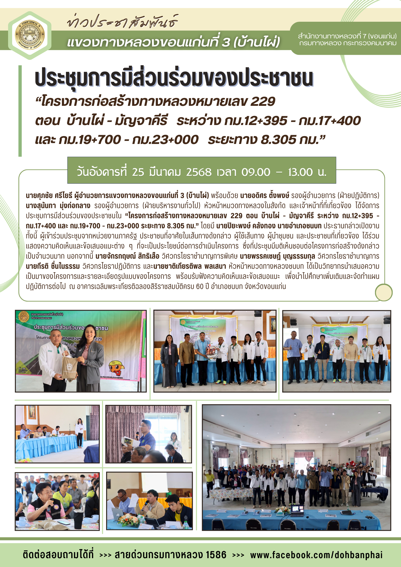 #นายศุภชัย ศรีโยธี ผู้อำนวยการแขวงทางหลวงขอนแก่นที่ 3 (บ้านไผ่) พร้อมด้วย นายอดิศร ตั้งพงษ์ รองผู้อำนวยการ (ฝ่ายปฏิบัติการ) นางสุนันทา มุ่งก่อกลาง รองผู้อำนวยการ (ฝ่ายบริหารงานทั่วไป) หัวหน้าหมวดทางหลวงในสังกัด และเจ้าหน้าที่ที่เกี่ยวข้อง ได้จัดการประชุมการมีส่วนร่วมของประชาชนใน “โครงการก่อสร้างทางหลวงหมายเลข 229 ตอน บ้านไผ่ - มัญจาคีรี ระหว่าง กม.12+395 - กม.17+400 และ กม.19+700 - กม.23+000 ระยะทาง 8.305 กม.” โดยมี นายปิยะพงษ์ คลังทอง นายอำเภอชนบท ประธานกล่าวเปิดงาน ทั้งนี้ ผู้เข้าร่วมประชุมจากหน่วยงานภาครัฐ ประชาชนที่อาศัยในเส้นทางดังกล่าว ผู้ใช้เส้นทาง ผู้นำชุมชน และประชาชนที่เกี่ยวข้อง ได้ร่วมแสดงความคิดเห็นและข้อเสนอแนะต่าง ๆ ที่จะเป็นประโยชน์ต่อการดำเนินโครงการ ซึ่งที่ประชุมมีมติเห็นชอบต่อโครงการก่อสร้างดังกล่าวเป็นจำนวนมาก นอกจากนี้ นายจักรกฤษณ์ สิทธิเสือ วิศวกรโยธาชำนาญการพิเศษ นายพรรคเชษฎ์ บุญธรรมกุล วิศวกรโยธาชำนาญการ นายกีรติ ชื่นในธรรม วิศวกรโยธาปฏิบัติการ และนายชาติเกียรติพล พลเสนา หัวหน้าหมวดทางหลวงชนบท ได้เป็นวิทยากรนำเสนอความเป็นมาของโครงการและรายละเอียดรูปแบบของโครงการ พร้อมรับฟังความคิดเห็นและข้อเสนอแนะ เพื่อนำไปศึกษาเพิ่มเติมและจัดทำแผนปฏิบัติการต่อไป ณ อาคารเฉลิมพระเกียรติฉลองสิริราชสมบัติครบ 60 ปี อำเภอชนบท จังหวัดขอนแก่น