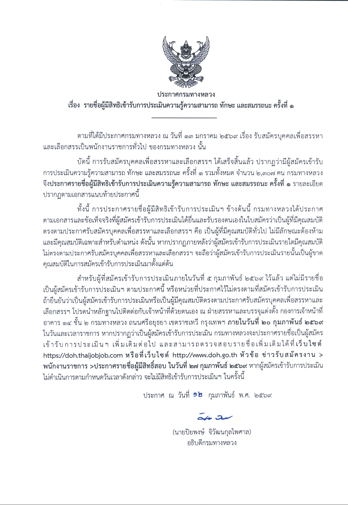 ประกาศกรมทางหลวง เรื่อง รายชื่อผู้มีสิทธิเข้ารับการประเมินความรู้ความสามารถ ทักษะ และสมรรถนะ ครั้งที่ ๑ ตามที่ได้มีประกาศกรมทางหลวง ณ วันที่ ๑๓ มกราคม ๒๕๖๙ เรื่อง รับสมัครบุคคลเพื่อสรรหา และเลือกสรรเป็นพนักงานราชการทั่วไป