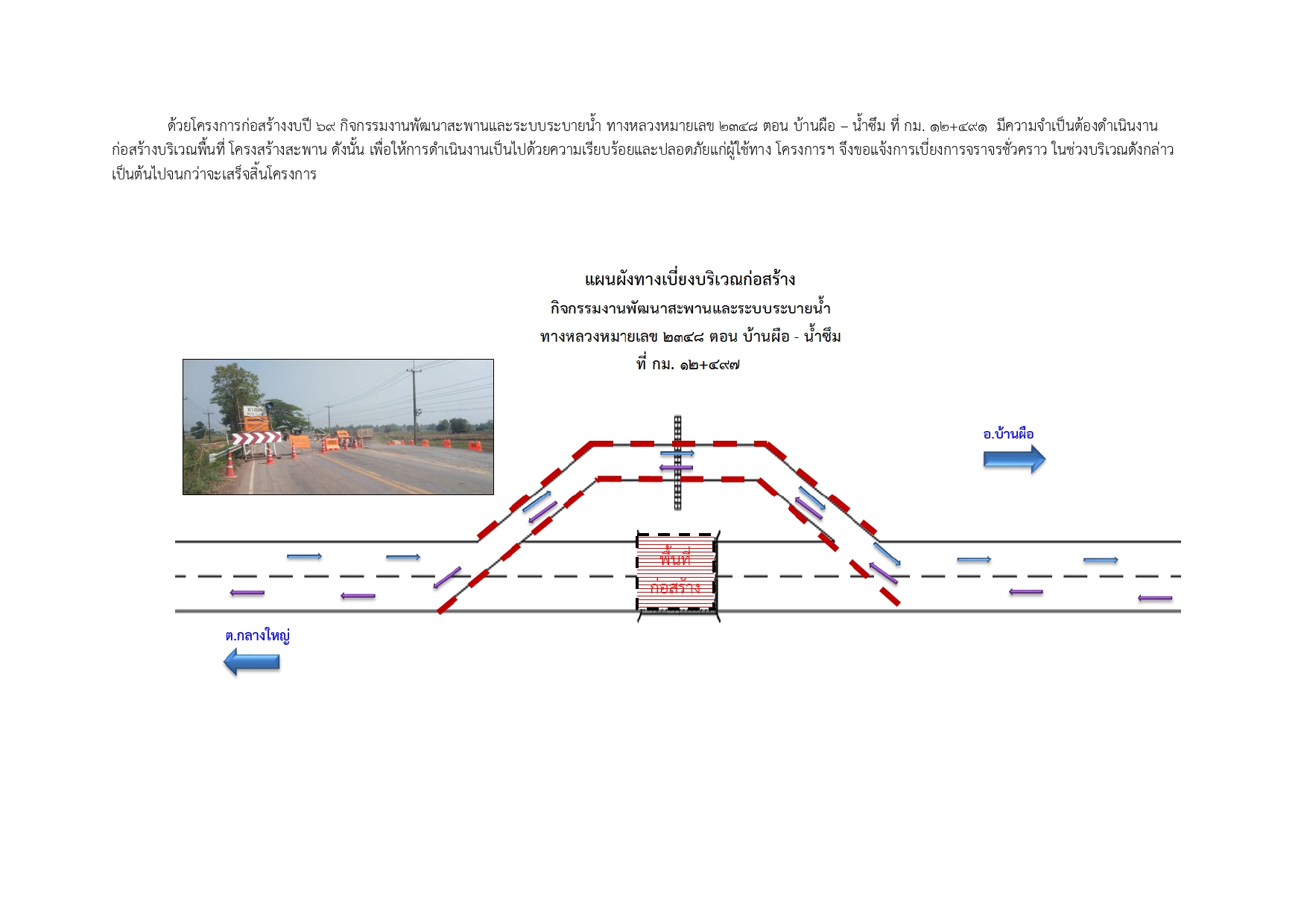 เบี่ยงการจราจรชั่วคราว กิจกรรมงานพัฒนาสะพานและระบบระบายน้ำ ทางหลวงหมายเลข 2348 ตอน บ้านผือ – น้ำซึม ที่ กม. 12+491