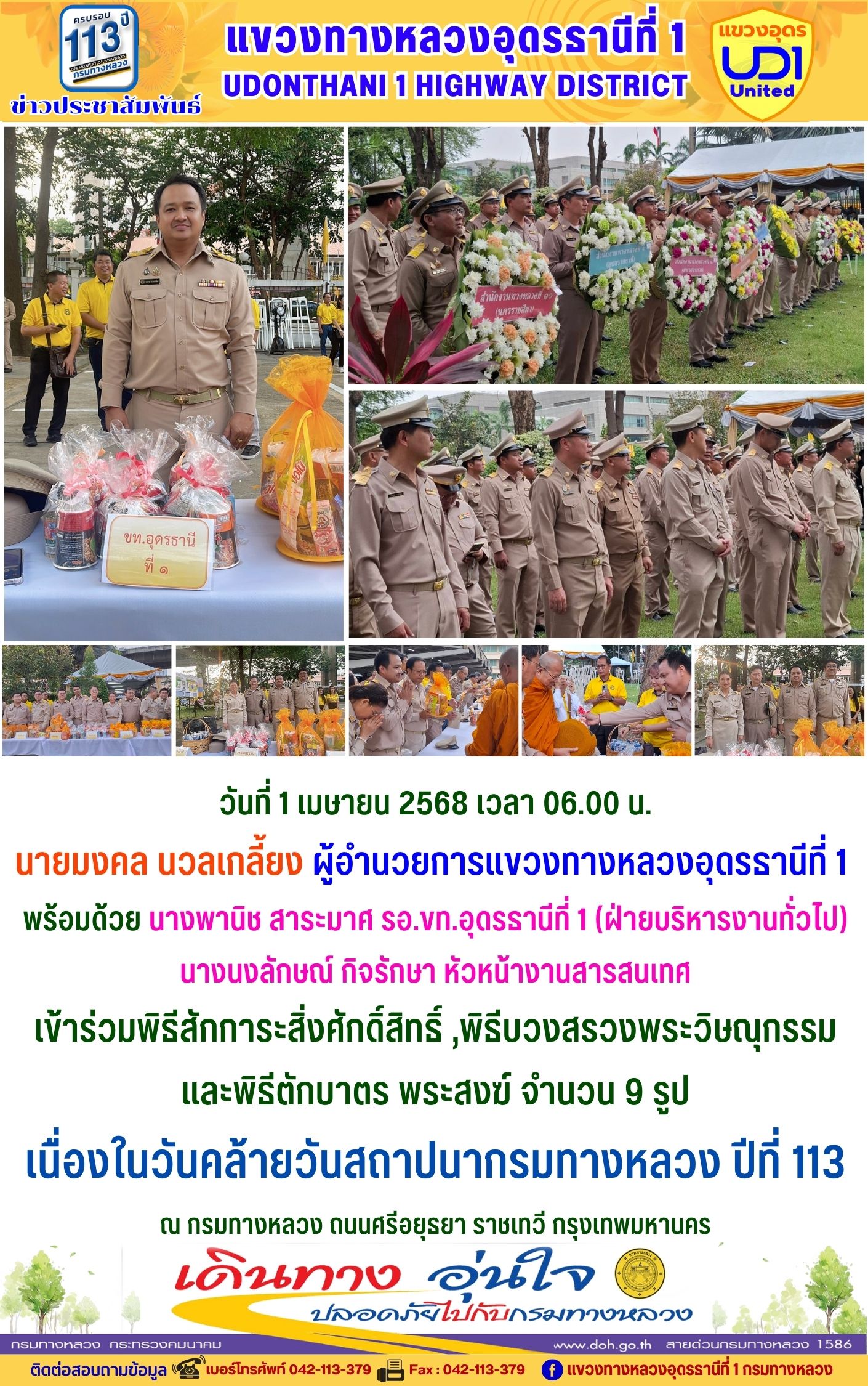 เข้าร่วมพิธีสักการะสิ่งศักดิ์สิทธิ์ ,พิธีบวงสรวงพระวิษณุกรรม และพิธีตักบาตร พระสงฆ์ จำนวน 9 รูป เนื่องในวันคล้ายวันสถาปนากรมทางหลวง ปีที่ 113