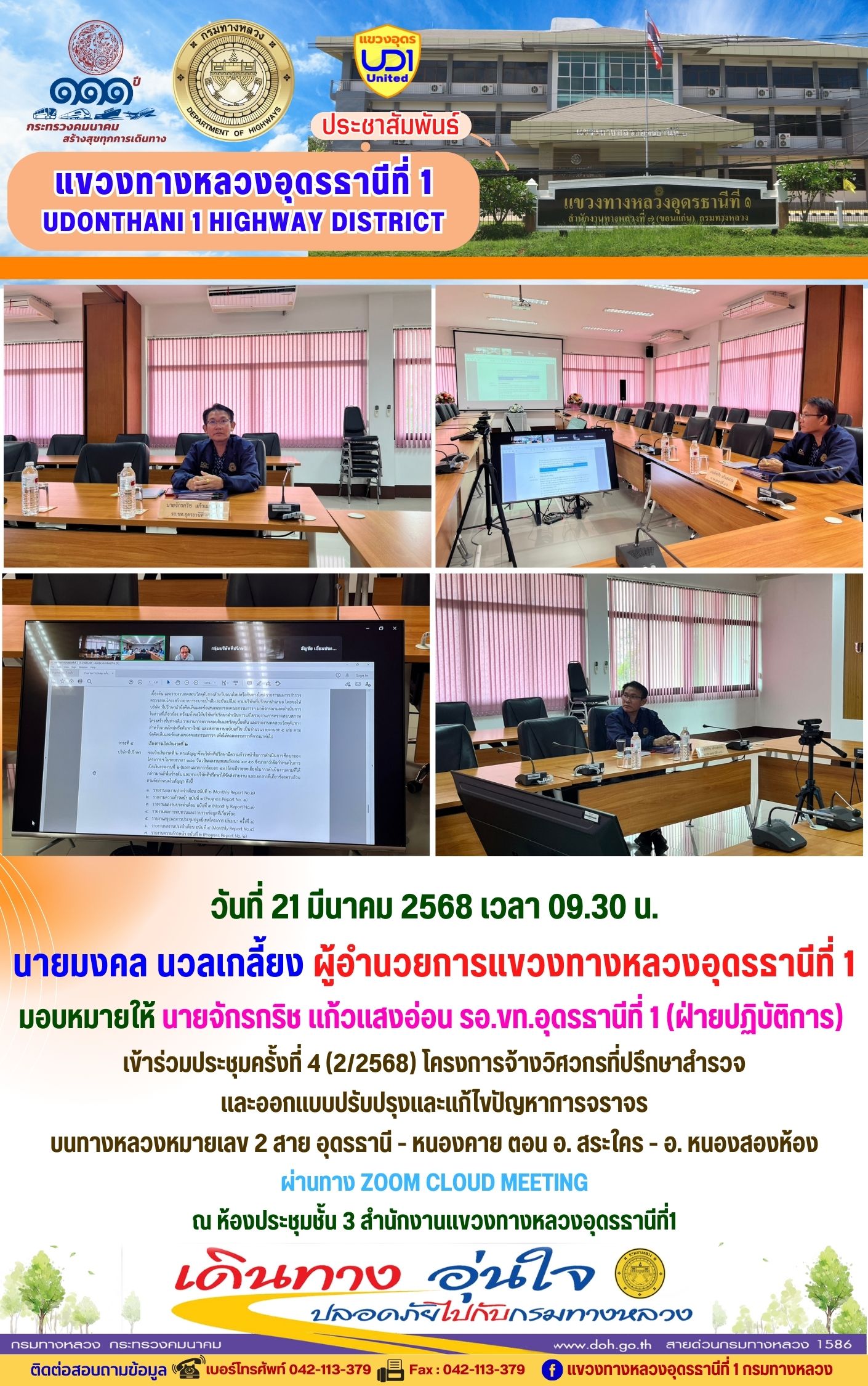 เข้าร่วมประชุมครั้งที่ 4 (2/2568) โครงการจ้างวิศวกรที่ปรึกษาสำรวจ และออกแบบปรับปรุงและแก้ไขปัญหาการจราจร บนทางหลวงหมายเลข 2 สาย อุดรธานี - หนองคาย ตอน อ. สระใคร - อ. หนองสองห้อง