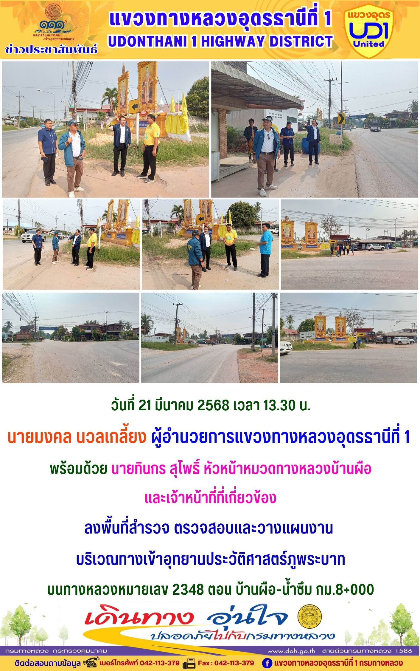 ลงพื้นที่สำรวจ ตรวจสอบและวางแผนงาน บริเวณทางเข้าอุทยานประวัติศาสตร์ภูพระบาท บนทางหลวงหมายเลข 2348 ตอน บ้านผือ-น้ำซึม กม.8+000
