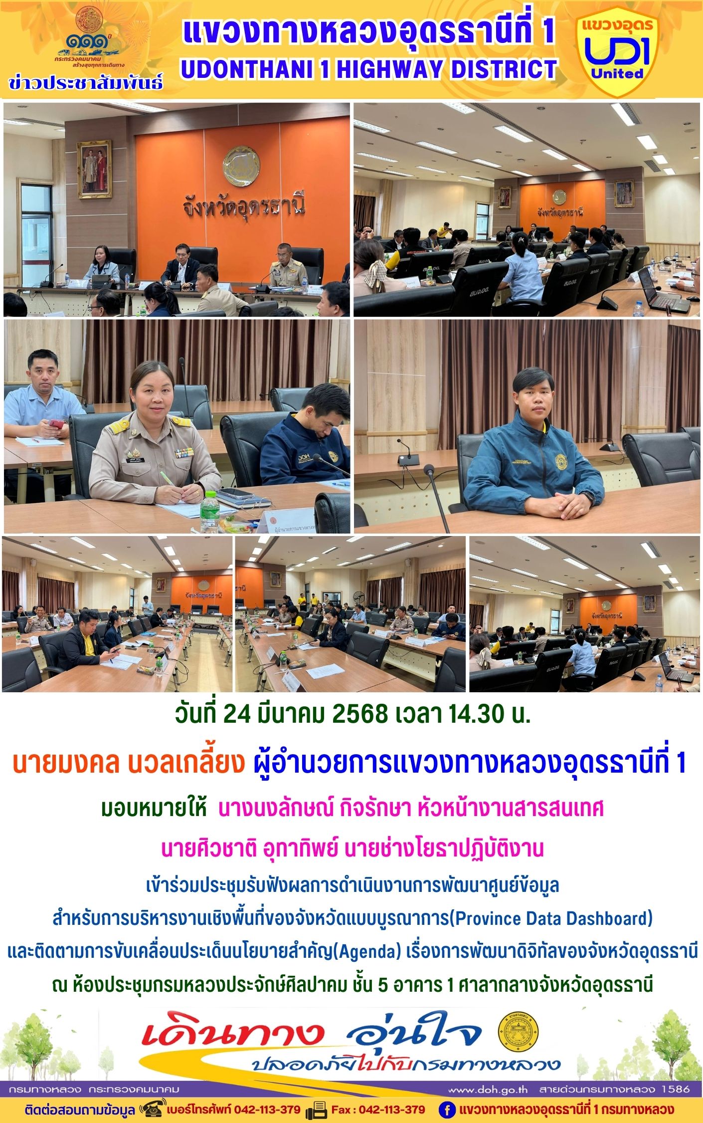 เข้าร่วมประชุมรับฟังผลการดำเนินงานการพัฒนาศูนย์ข้อมูล สำหรับการบริหารงานเชิงพื้นที่ของจังหวัดแบบบูรณาการ(Province Data Dashboard) และติดตามการขับเคลื่อนประเด็นนโยบายสำคัญ(Agenda) เรื่องการพัฒนาดิจิทัลของจังหวัดอุดรธานี