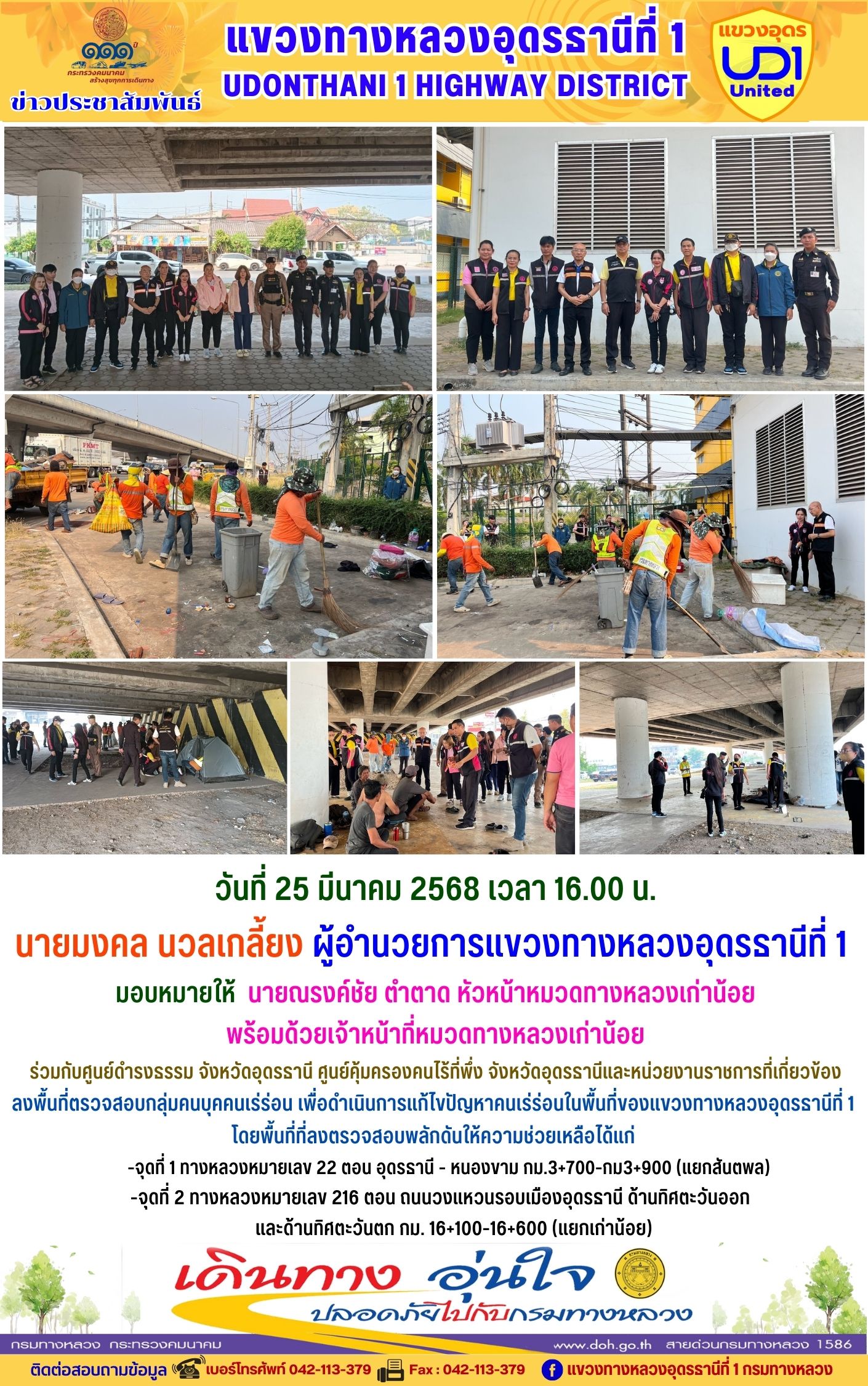 ลงพื้นที่ตรวจสอบกลุ่มคนบุคคนเร่ร่อน เพื่อดำเนินการแก้ไขปัญหาคนเร่ร่อนในพื้นที่ของแขวงทางหลวงอุดรธานีที่ 1