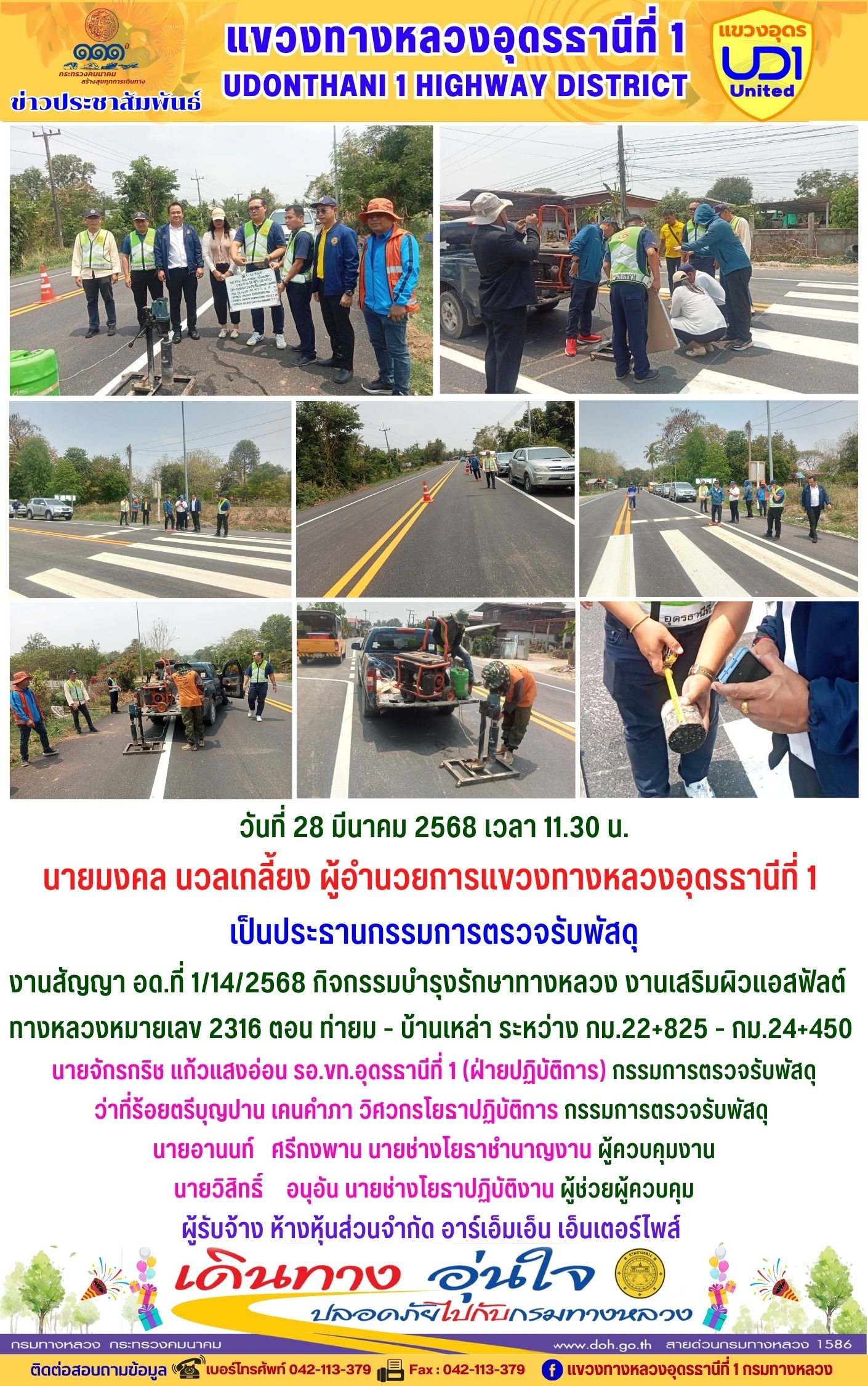 ตรวจรับพัสดุ งานสัญญา อด.ที่ 1/14/2568 กิจกรรมบำรุงรักษาทางหลวง งานเสริมผิวแอสฟัลต์ ทางหลวงหมายเลข 2316 ตอน ท่ายม - บ้านเหล่า ระหว่าง กม.22+825 - กม.24+450