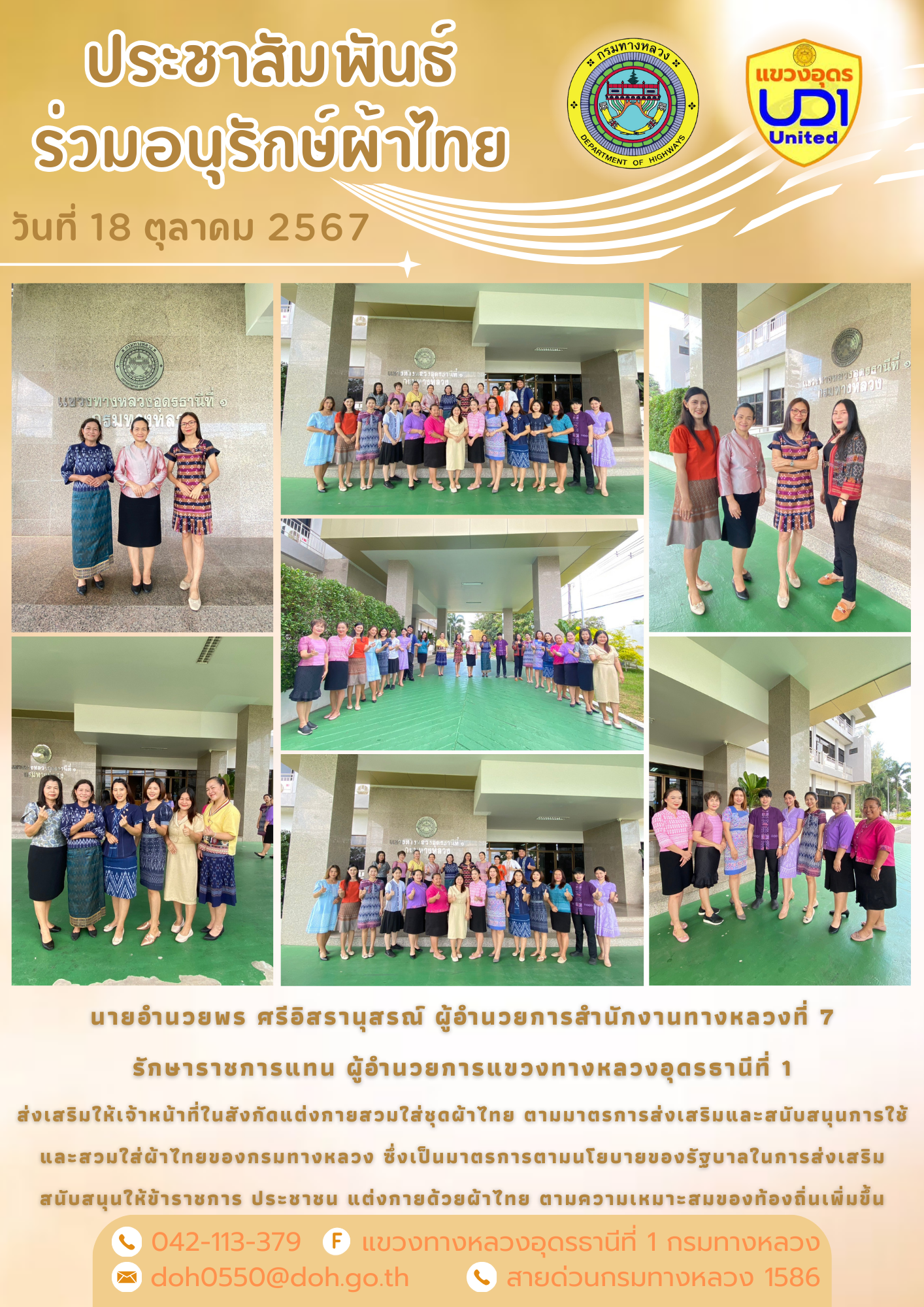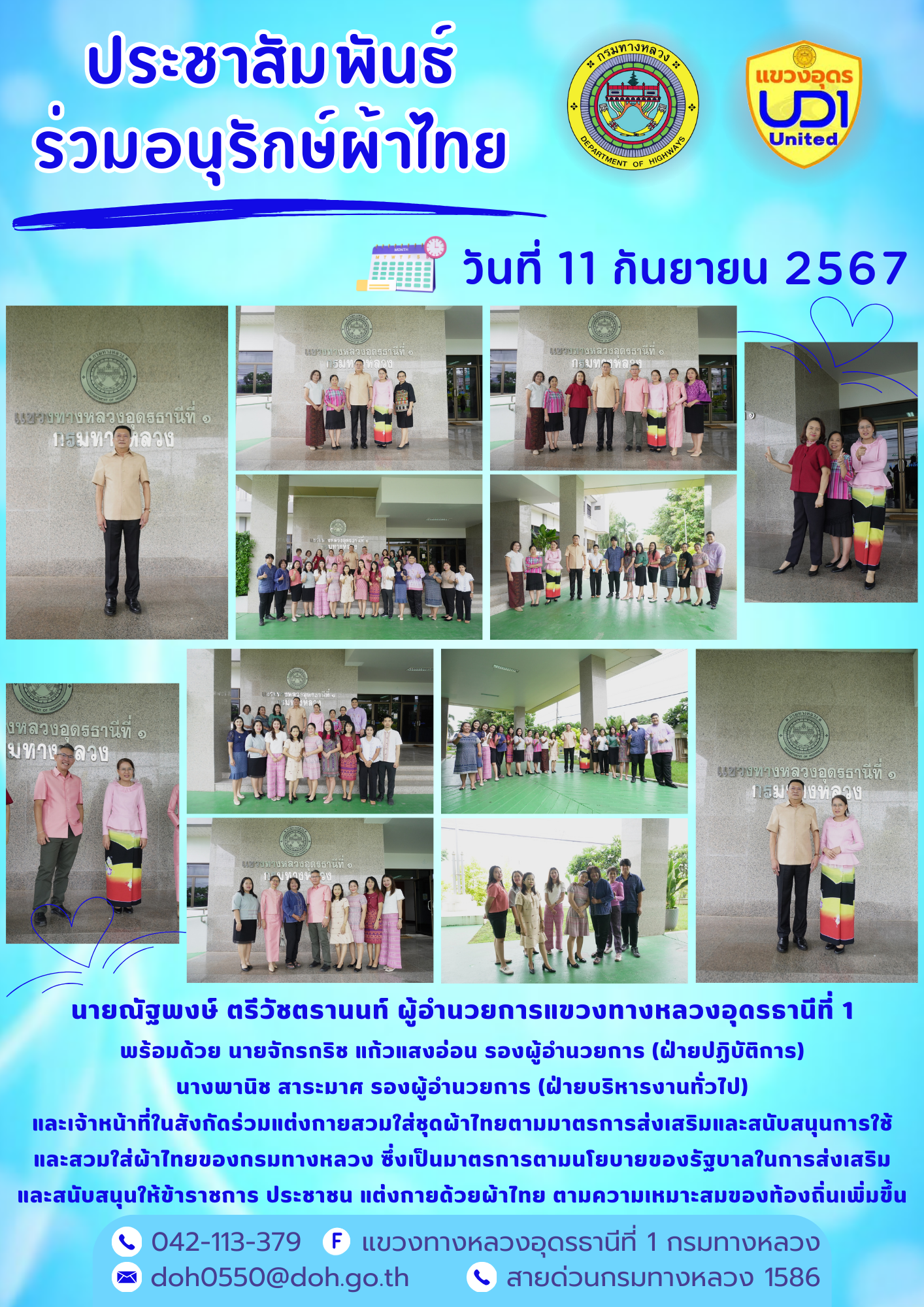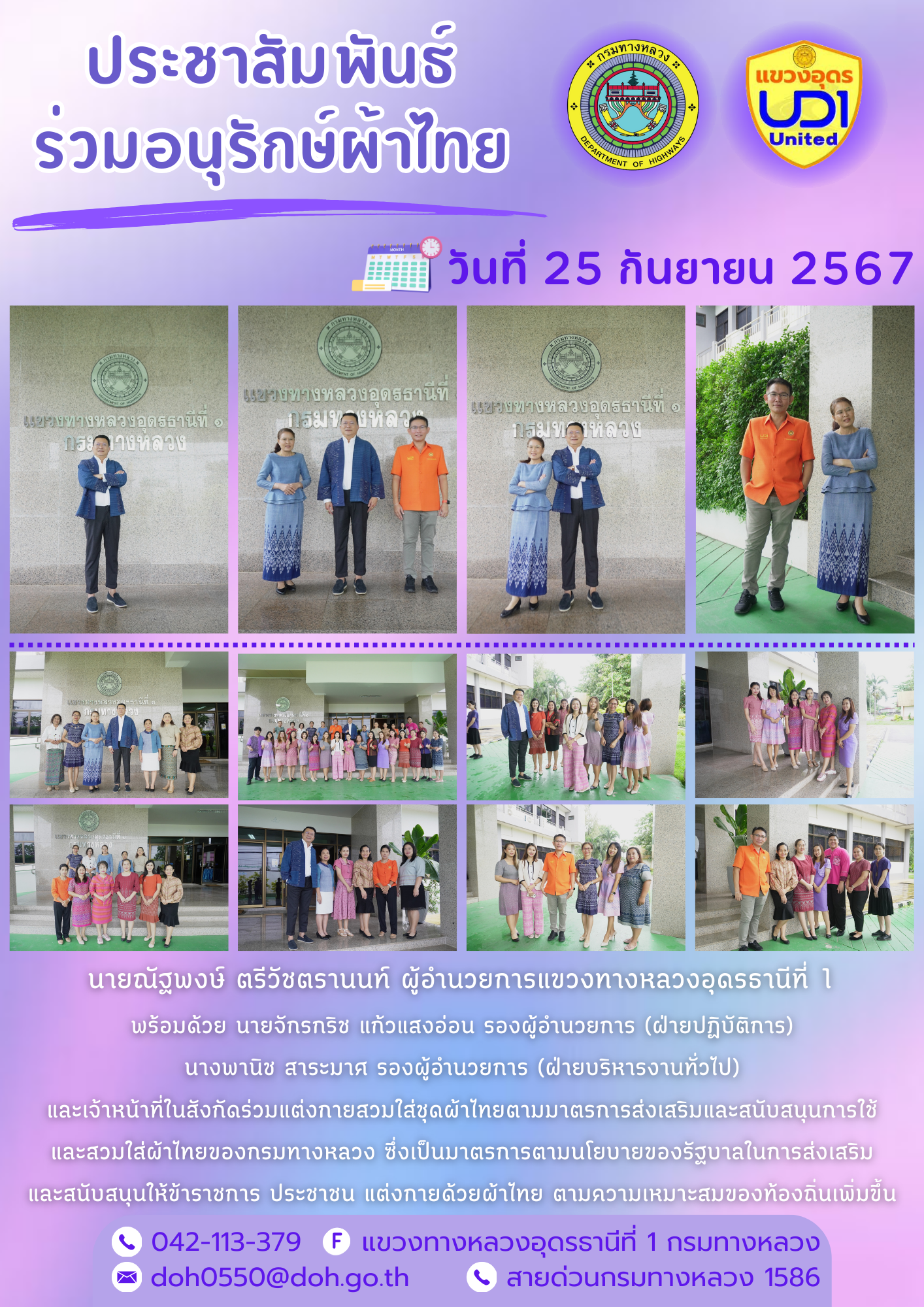 นายณัฐพงษ์ ตรีวัชตรานนท์ ผู้อำนวยการแขวงทางหลวงอุดรธานีที่ 1 พร้อมด้วย นายจักรกริช แก้วแสงอ่อน รองผู้อำนวยการ (ฝ่ายปฏิบัติการ) นางพานิช สาระมาศ รองผู้อำนวยการ (ฝ่ายบริหารงานทั่วไป) และเจ้าหน้าที่ในสังกัดร่วมแต่งกายสวมใส่ชุดผ้าไทยตามมาตรการส่งเสริมและสนับสนุนการใช้ และสวมใส่ผ้าไทยของกรมทางหลวง ซึ่งเป็นมาตรการตามนโยบายของรัฐบาลในการส่งเสริม และสนับสนุนให้ข้าราชการ ประชาชน แต่งกายด้วยผ้าไทย ตามความเหมาะสมของท้องถิ่นเพิ่มขึ้น