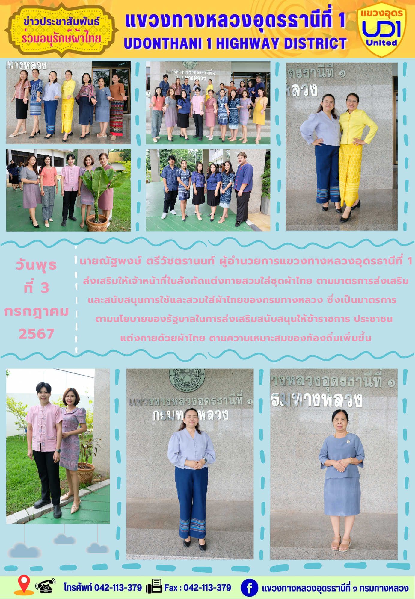 นายณัฐพงษ์ ตรีวัชตรานนท์ ผู้อำนวยการแขวงทางหลวงอุดรธานีที่ 1 พร้อมด้วย นายศุภชัย ศรีโยธี รองผู้อำนวยการ (ฝ่ายวิศวกรรม) นางพานิช สาระมาศ รองผู้อำนวยการ (ฝ่ายบริหารงานทั่วไป) นายจักรกริช แก้วแสงอ่อน รองผู้อำนวยการ (ฝ่ายปฏิบัติการ) และเจ้าหน้าที่ในสังกัดร่วมแต่งกายสวมใส่ชุดผ้าไทยตามมาตรการส่งเสริม และสนับสนุนการใช้และสวมใส่ผ้าไทยของกรมทางหลวง ซึ่งเป็นมาตรการตามนโยบายของรัฐบาลในการส่งเสริมและสนับสนุนให้ข้าราชการ ประชาชน แต่งกายด้วยผ้าไทย ตามความเหมาะสมของท้องถิ่นเพิ่มขึ้น