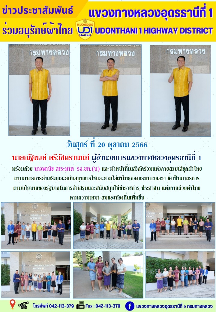 นายณัฐพงษ์ ตรีวัชตรานนท์ ผู้อำนวยการแขวงทางหลวงอุดรธานีที่ 1 พร้อมด้วย นางพานิช สาระมาศ รอ.ขท.(บ) และเจ้าหน้าที่ในสังกัดร่วมแต่งกายสวมใส่ชุดผ้าไทย ตามมาตรการส่งเสริมและสนับสนุนการใช้และสวมใส่ผ้าไทยของกรมทางหลวง ซึ่งเป็นมาตรการตามนโยบายของรัฐบาลในกาiส่งเสริมและสนับสนุนให้ข้าราชการ ประชาชน แต่งกายด้วยผ้าไทย ตามความเหมาะสมของท้องถิ่นเพิ่มขึ้น