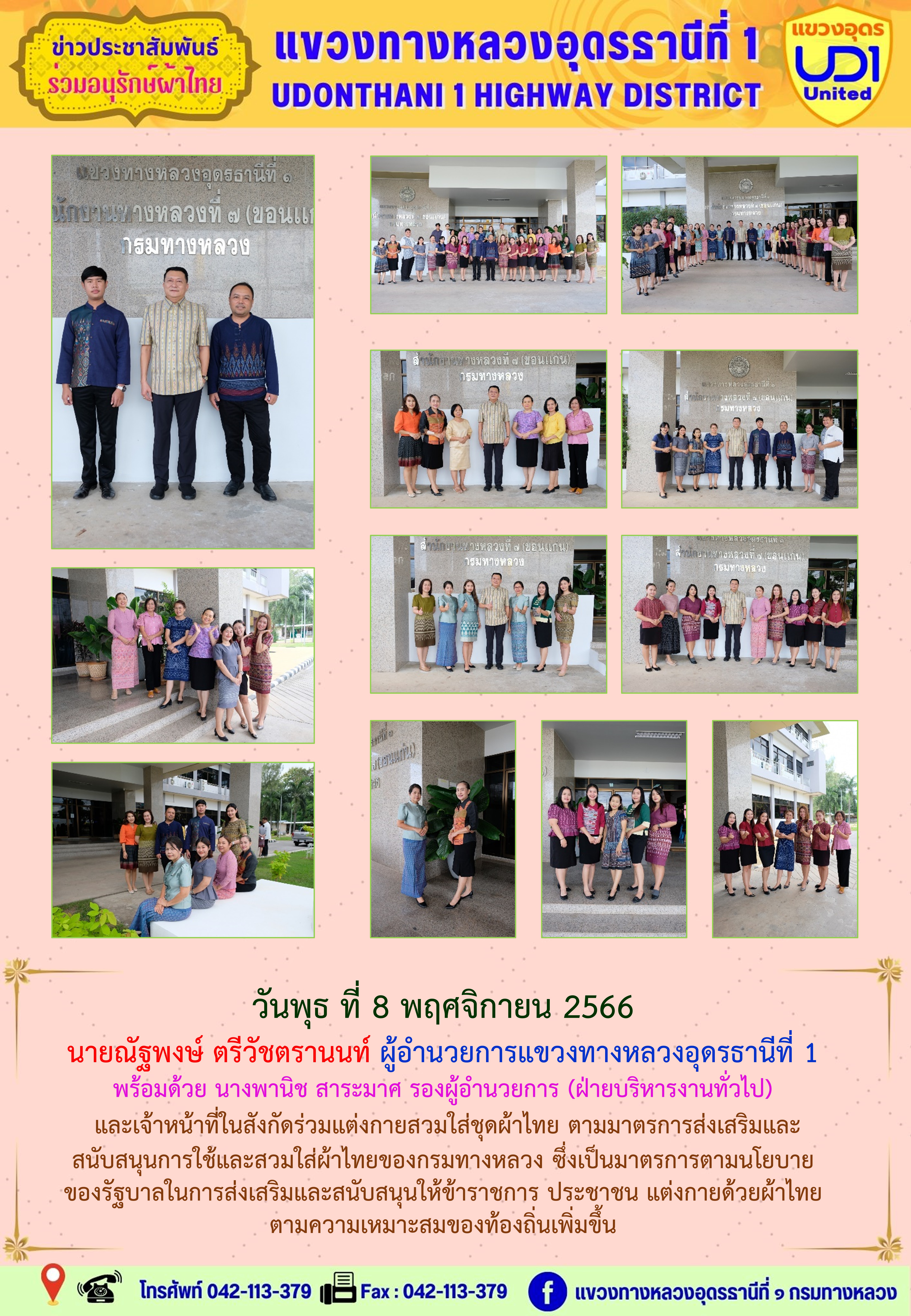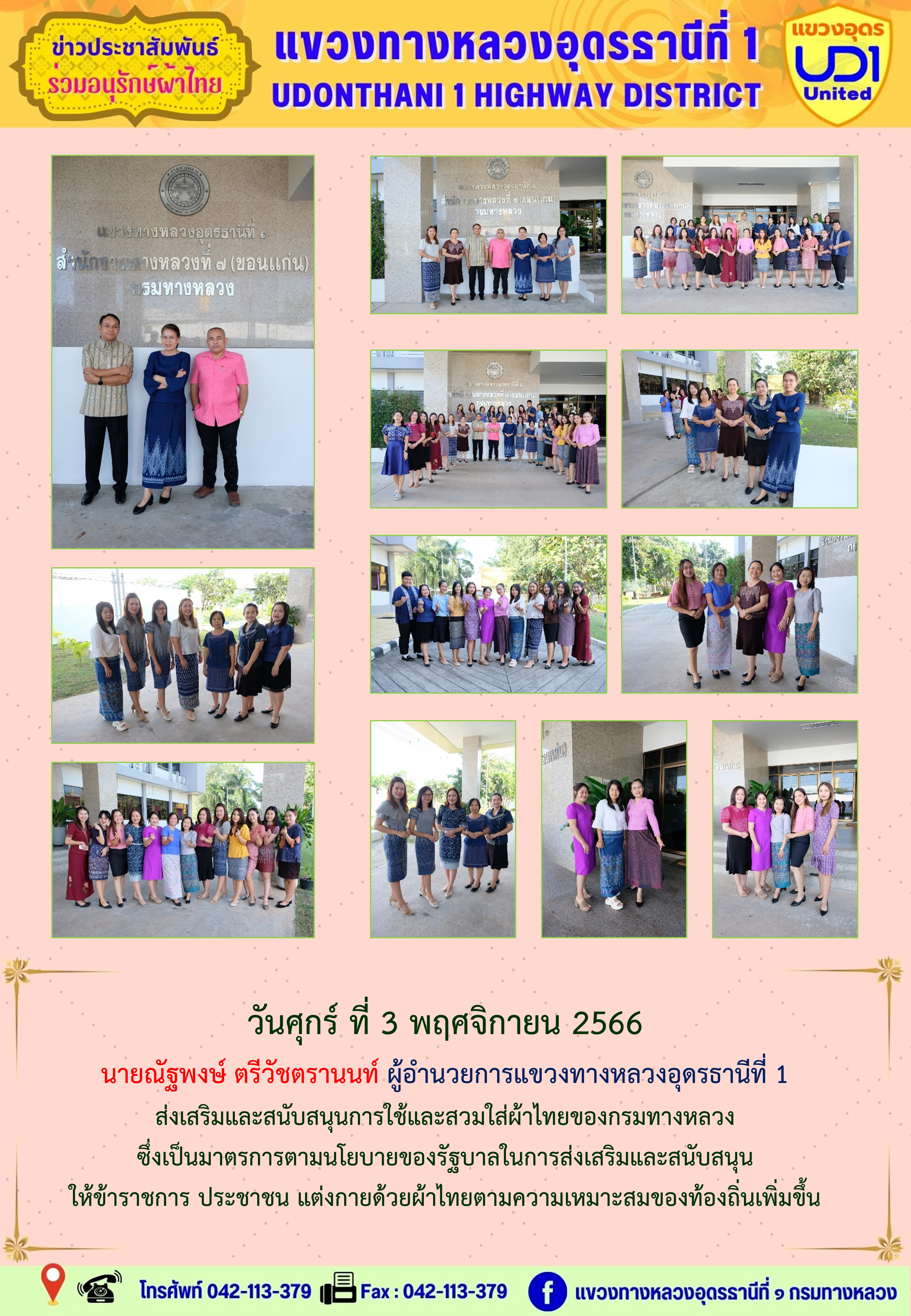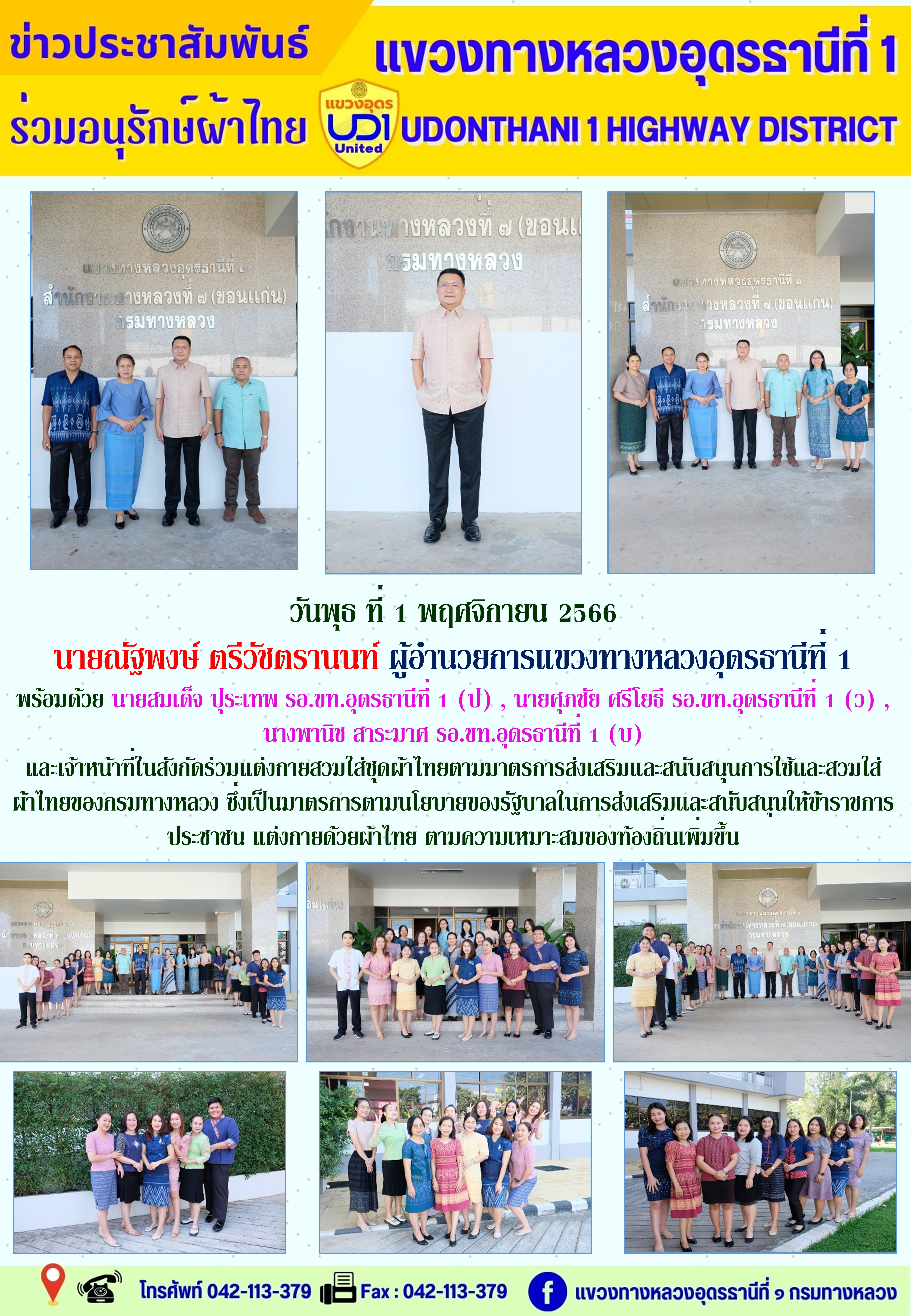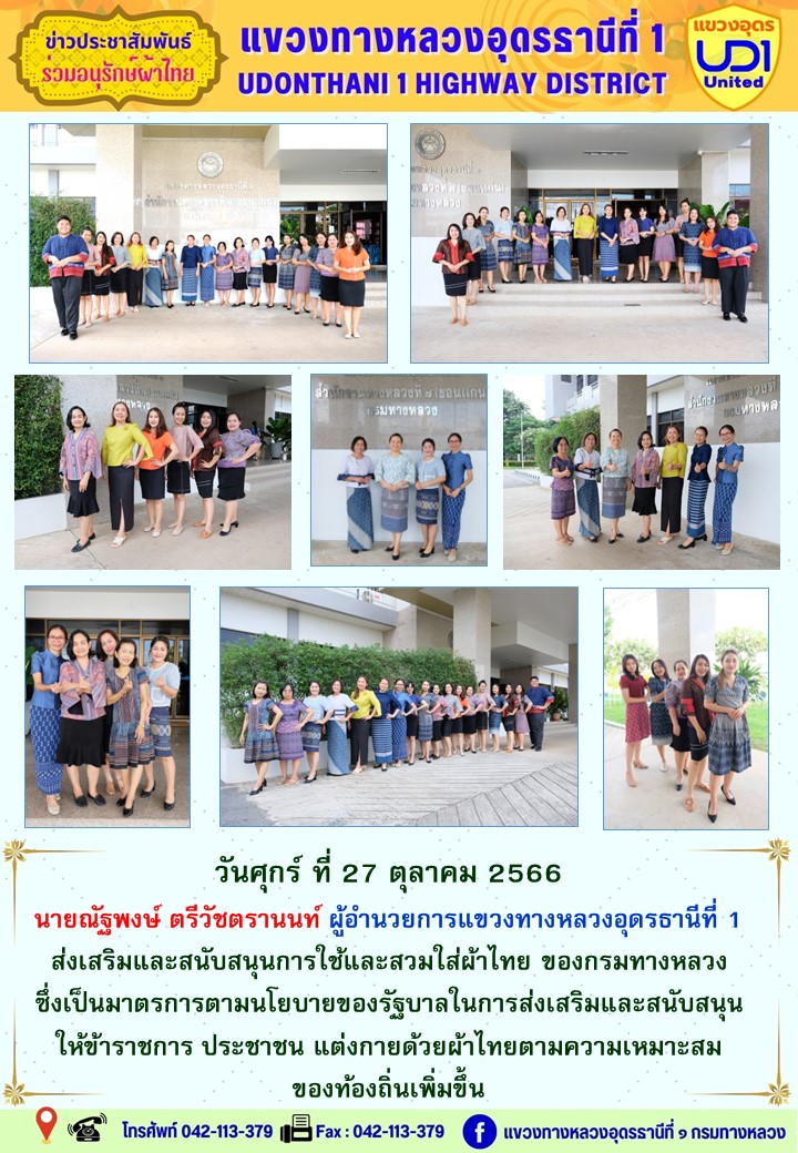 นายณัฐพงษ์ ตรีวัชตรานนท์ ผู้อำนวยการแขวงทางหลวงอุดรธานีที่ 1 พร้อมด้วย นายสมเด็จ ปุระเทพ รอ.ขท.อุดรธานีที่ 1 (ป) ,นายศุภชัย ศรีโยธี รอ.ขท.อุดรธานีที่ 1 (ว) นางพานิช สาระมาศ รอ.ขท.อุดรธานีที่ 1 (บ) และเจ้าหน้าที่ในสังกัดร่วมแต่งกายสวมใส่ชุดผ้าไทย ตามมาตรการส่งเสริมและสนับสนุนการใช้และสวมใส่ผ้าไทยของกรมทางหลวง ซึ่งเป็นมาตรการตามนโยบายของรัฐบาลในการส่งเสริมและสนับสนุนให้ข้าราชการ ประชาชน แต่งกายด้วยผ้าไทย ตามความเหมาะสมของท้องถิ่นเพิ่มขึ้น