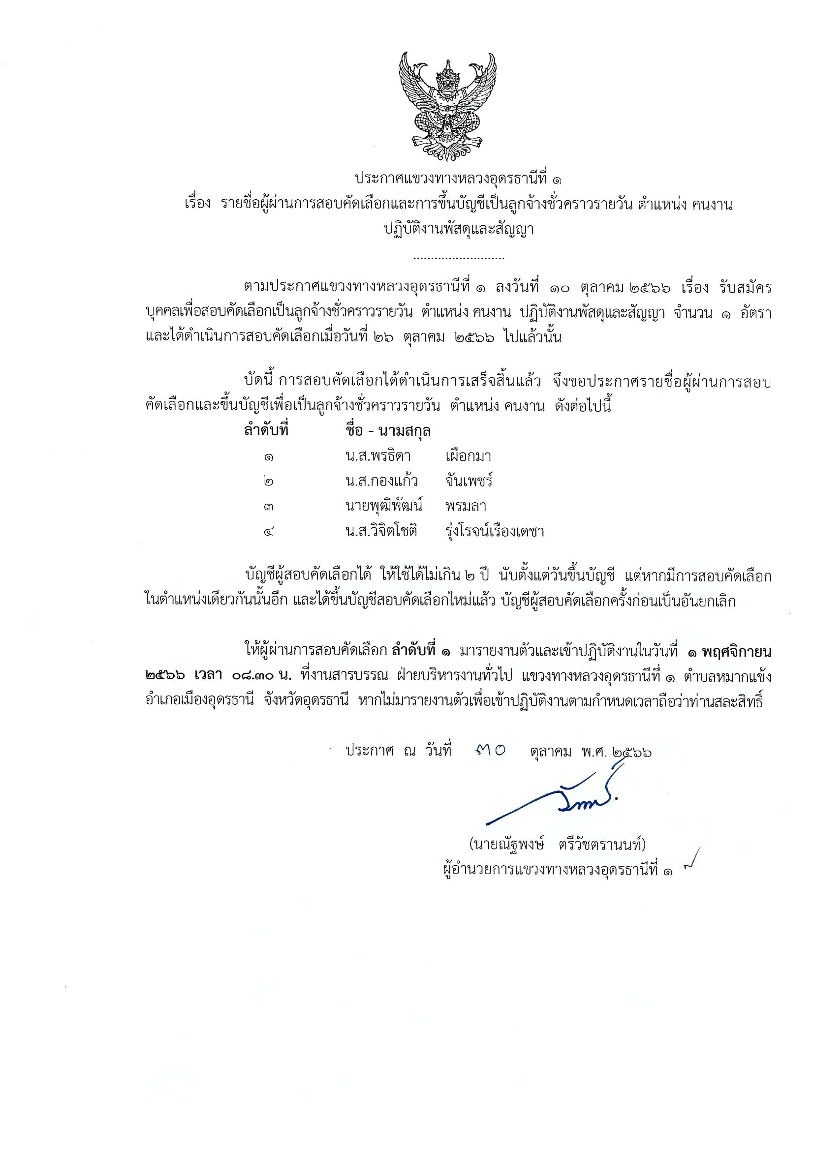 ประกาศแขวงทางหลวงอุดรธานีที่ ๑ รายชื่อผู้ผ่านการสอบคัดเลือกและการขึ้นบัญชีเป็นลูกจ้างชั่วคราวรายวัน ตำแหน่ง คนงาน ปฏิบัติงานพัสดุและสัญญา