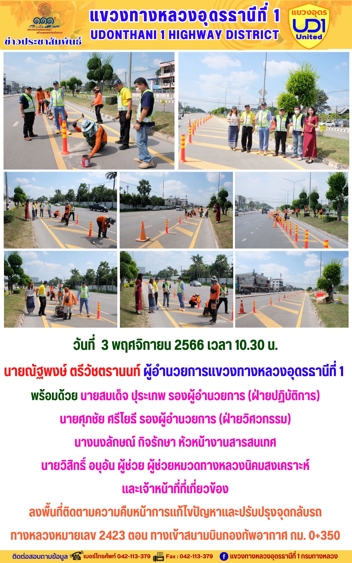 นายณัฐพงษ์ ตรีวัชตรานนท์ ผู้อำนวยการแขวงทางหลวงอุดรธานีที่ 1 ลงพื้นที่ติดตามความคืบหน้าการแก้ไขปัญหาและปรับปรุงจุดกลับรถ ทางหลวงหมายเลข 2423 ตอน ทางเข้าสนามบินกองทัพอากาศ กม. 0+350
