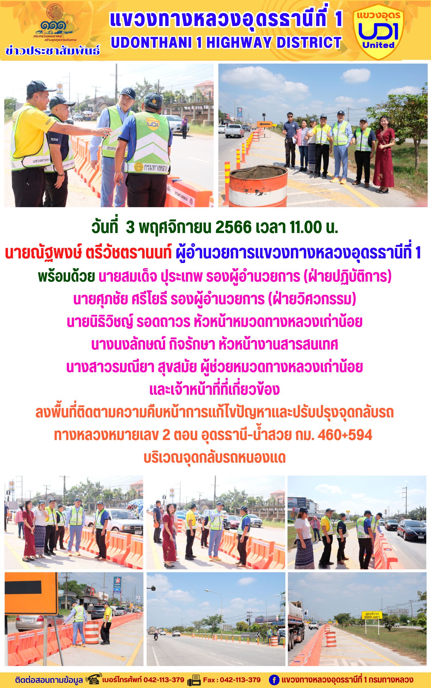 นายณัฐพงษ์ ตรีวัชตรานนท์ ผู้อำนวยการแขวงทางหลวงอุดรธานีที่ 1 ลงพื้นที่ติดตามความคืบหน้าการแก้ไขปัญหาและปรับปรุงจุดกลับรถ ทาง?หลวงหมายเลข 2 ตอน อุดรธานี-น้ำสวย กม. 460+594 บริเวณจุดกลับรถหนองแด