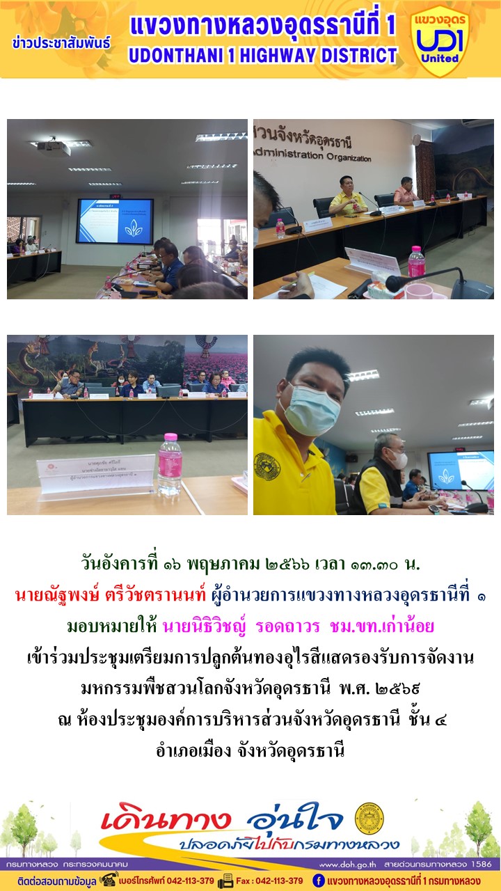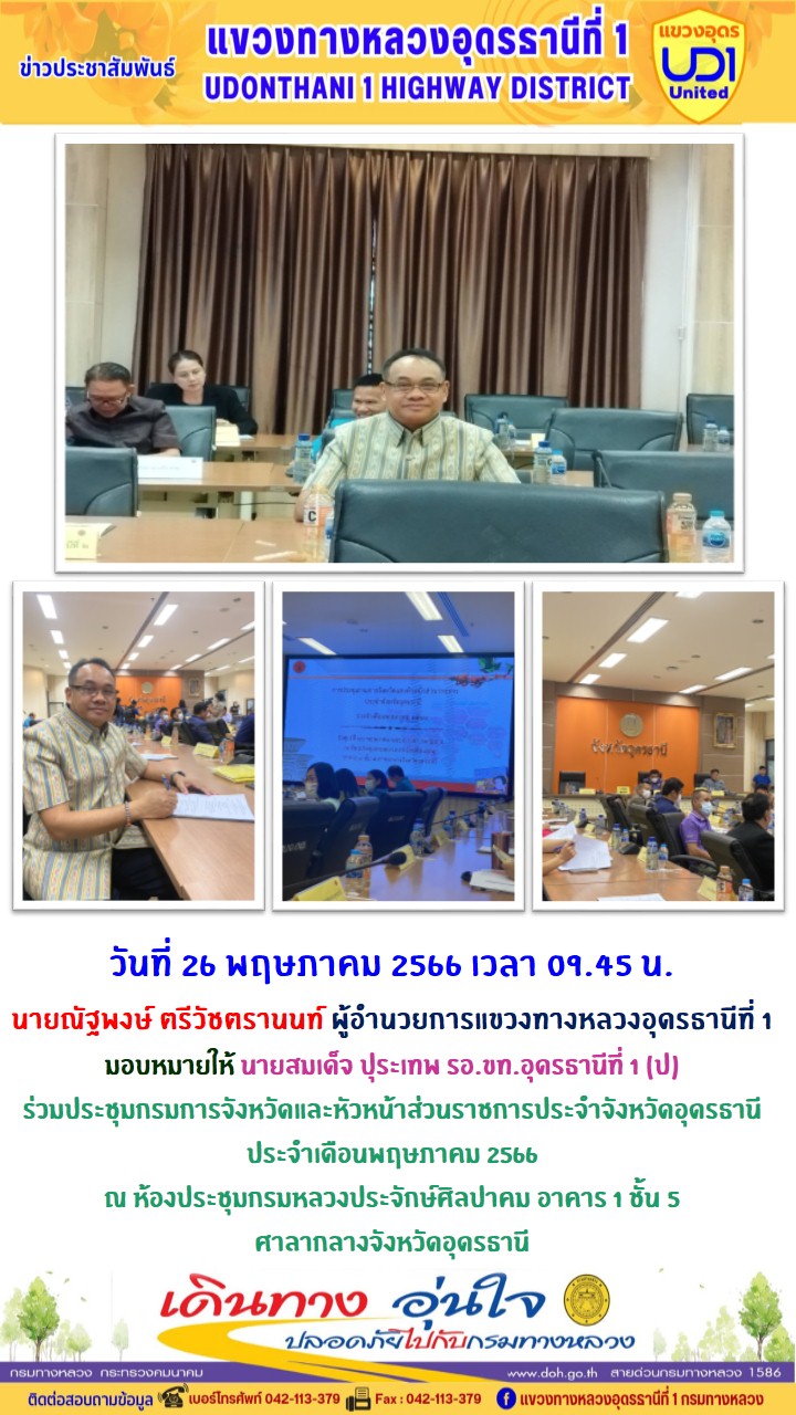 นายณัฐพงษ์ ตรีวัชตรานนท์ ผู้อำนวยการแขวงทางหลวงอุดรธานีที่ 1 มอบหมายให้ นายสมเด็จ ปุระเทพ รอ.ขท.อุดรธานีที่ 1 (ป) ร่วมประชุมกรมการจังหวัดและหัวหน้าส่วนราชการประจำจังหวัดอุดรธานี ประจำเดือนพฤษภาคม 2566 ณ ห้องประชุมกรมหลวงประจักษ์ศิลปาคม อาคาร 1 ชั้น 5 ศาลากลางจังหวัดอุดรธานี