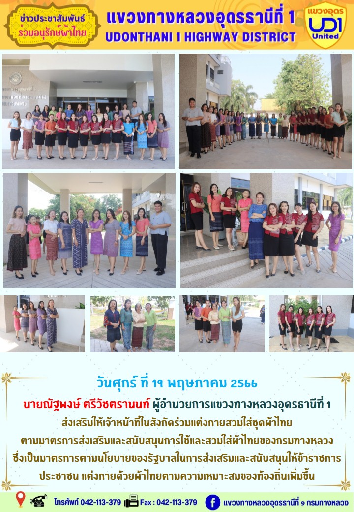 นายณัฐพงษ์ ตรีวัชตรานนท์ ผู้อำนวยการแขวงทางหลวงอุดรธานีที่ 1 พร้อมด้วย นายสมเด็จ ปุระเทพ รอ.ขท.อุดรธานีที่ 1 (ป) ,นายศุภชัย ศรีโยธี รอ.ขท.อุดรธานีที่ 1 (ว) นางพานิช สาระมาศ รอ.ขท.อุดรธานีที่ 1 (บ) และเจ้าหน้าที่ในสังกัดร่วมแต่งกายสวมใส่ชุดผ้าไทย ตามมาตรการส่งเสริมและสนับสนุนการใช้และสวมใส่ผ้าไทย ของกรมทางหลวง ซึ่งเป็นมาตรการตามนโยบายของรัฐบาลในการส่งเสริมและสนับสนุนให้ข้าราชการ ประชาชน แต่งกายด้วยผ้าไทย ตามความเหมาะสมของท้องถิ่นเพิ่มขึ้น