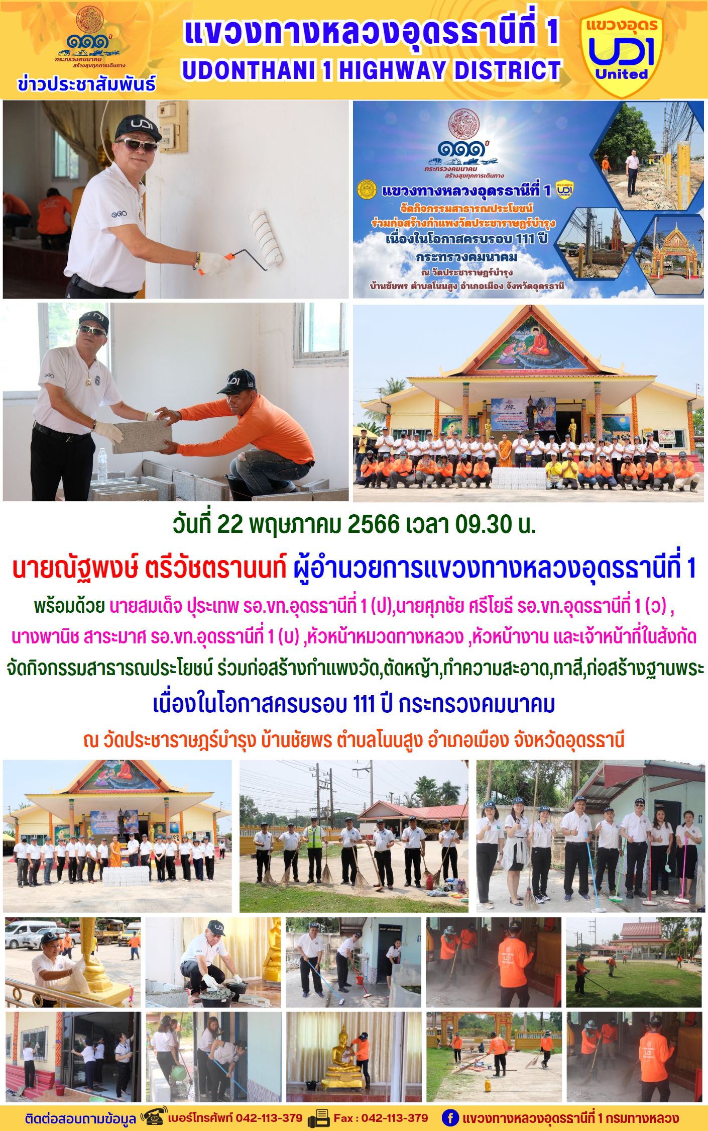 แขวงทางหลวงอุดรธานีที่ 1 จัดกิจกรรมสาธารณประโยชน์ ร่วม?ก่อสร้างกำแพงวัด,ตัดหญ้า,ทำความสะอาด,ทาสี,ก่อสร้างฐานพระ เนื่องในโอกาสครบรอบ 111 ปี กระทรวงคมนาคม