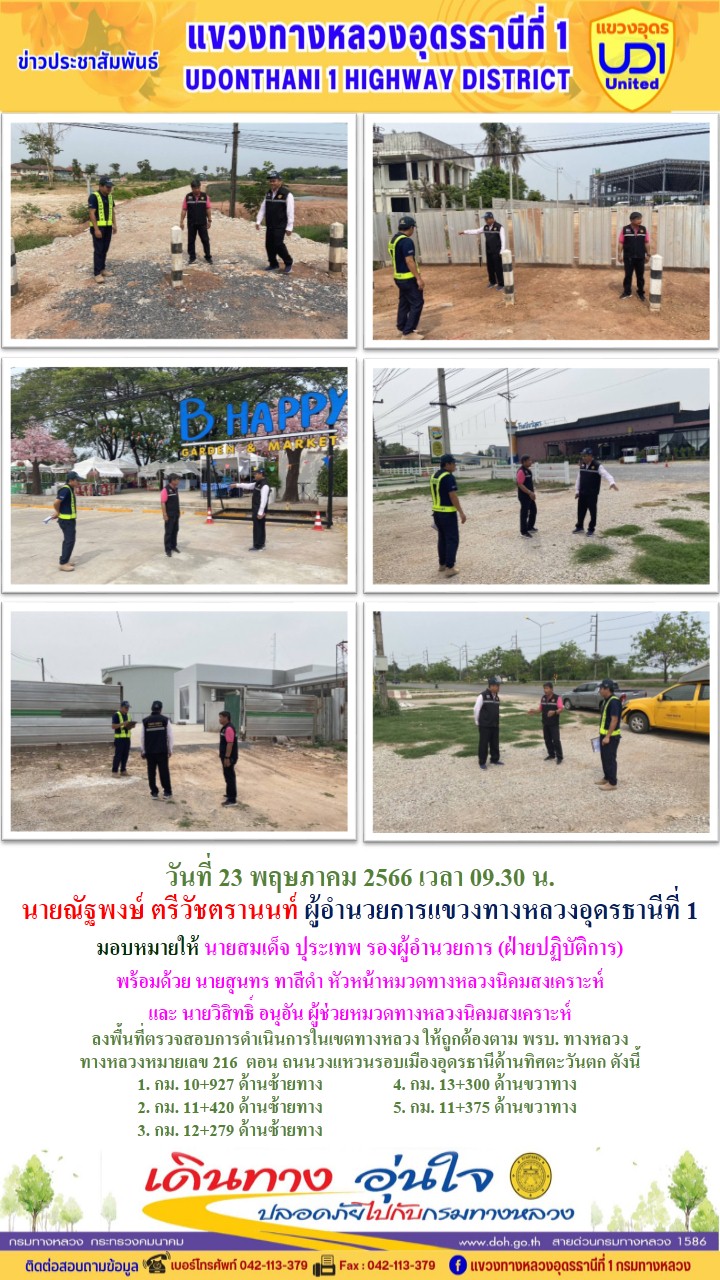 นายณัฐพงษ์ ตรีวัชตรานนท์ ผู้อำนวยการแขวงทางหลวงอุดรธานีที่ 1 มอบหมายให้ นายสมเด็จ ปุระเทพ รองผู้อำนวยการ (ฝ่ายปฏิบัติการ) พร้อมด้วย นายสุนทร ทาสีดำ หัวหน้าหมวดทางหลวงนิคมสงเคราะห์ และ นายวิสิทธิ์ อนุอัน ผู้ช่วยหมวดทางหลวงนิคมสงเคราะห์ ลงพื้นที่ตรวจสอบการดำเนินการในเขตทางหลวง ให้ถูกต้องตาม พรบ.ทางหลวง ทางหลวงหมายเลข 216 ตอน ถนนวงแหวนรอบเมืองอุดรธานีด้านทิศตะวันตก ดังนี้1. กม. 10+927 ด้านซ้ายทาง 2. กม. 11+420 ด้านซ้ายทาง 3. กม. 12+279 ด้านซ้ายทาง 4. กม. 13+300 ด้านขวาทาง 5. กม. 11+375 ด้านขวาทาง
