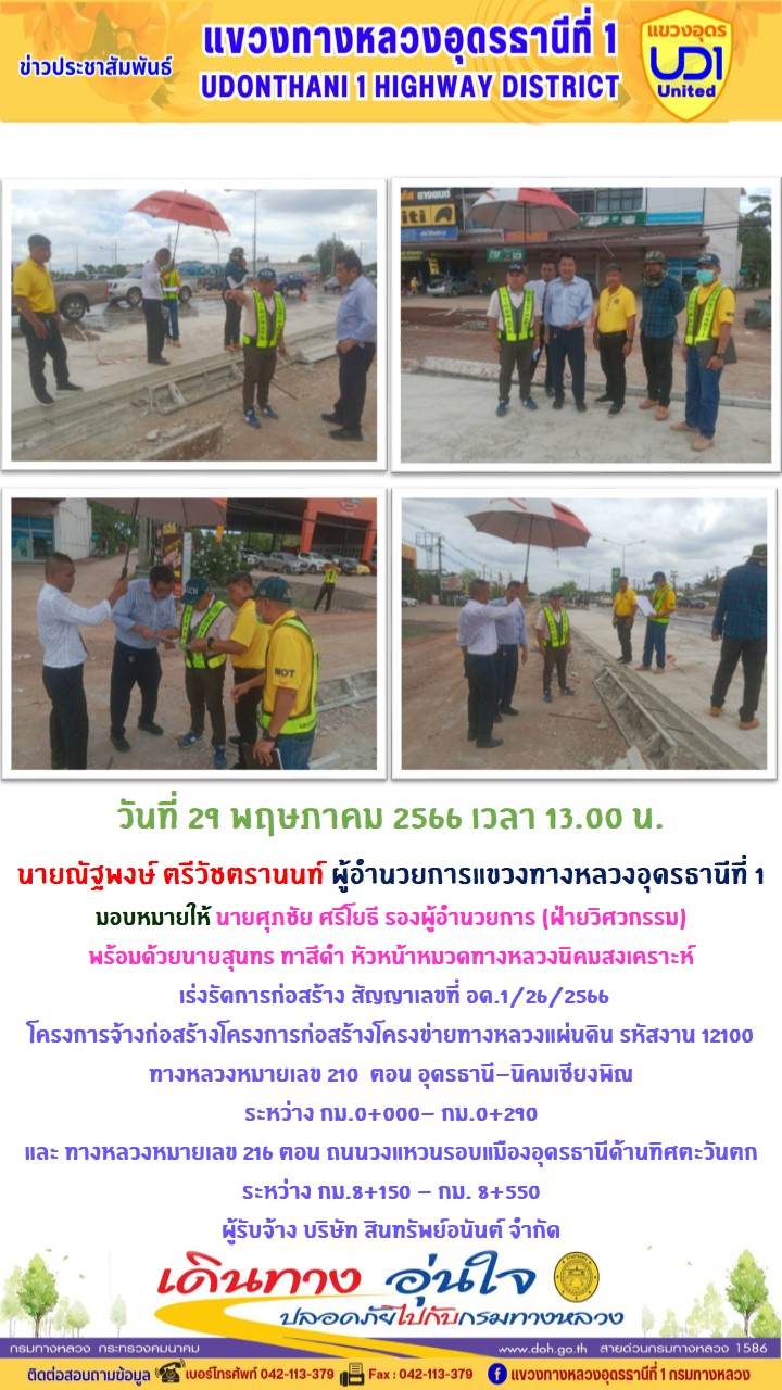 นายณัฐพงษ์ ตรีวัชตรานนท์ ผู้อำนวยการแขวงทางหลวงอุดรธานีที่ 1 มอบหมายให้ นายศุภชัย ศรีโยธี รองผู้อำนวยการ (ฝ่ายวิศวกรรม) พร้อมด้วยนายสุนทร ทาสีดำ หัวหน้าหมวดทางหลวงนิคมสงเคราะห์ เร่งรัดการก่อสร้าง สัญญาเลขที่ อด.1/26/2566 โครงการจ้างก่อสร้างโครงการก่อสร้างโครงข่ายทางหลวงแผ่นดิน รหัสงาน 12100 ทางหลวงหมายเลข 210 ตอน อุดรธานี-นิคมเชียงพิณ ระหว่าง กม.0+000- กม.0+290 และ ทางหลวงหมายเลข 216 ตอน ถนนวงแหวนรอบแมืองอุดรธานีด้านทิศตะวันตก ระหว่าง กม.8+150 - กม. 8+550 ผู้รับจ้าง บริษัท สินทรัพย์อนันต์ จำกัด