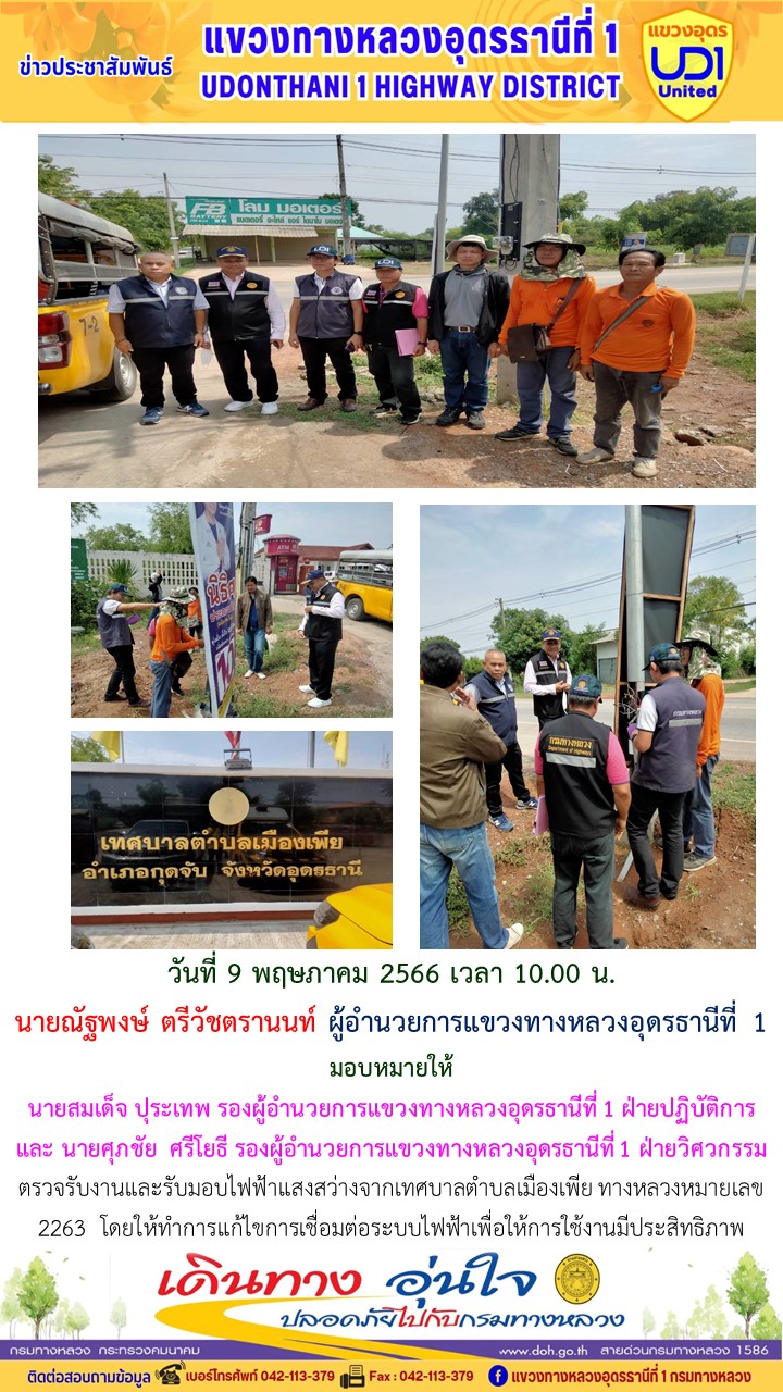 ตรวจรับงานไฟฟ้าแสงสว่างที่ เทศบาลตำบลเมืองเพีย ส่งมอบให้ และให้ทำการแก้ไข การเชื่อมต่อระบบไฟฟ้าเพื่อให้การใช้งานมีประสิทธิภาพ ในทางหลวงหมายเลข 2263 ตอน อุดรธานี-บ้านเพีย