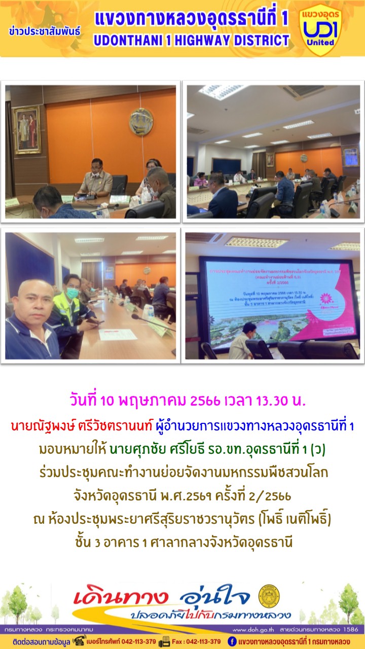 นายณัฐพงษ์ ตรีวัชตรานนท์ ผู้อำนวยการแขวงทางหลวงอุดรธานีที่ 1 มอบหมายให้ นายศุภชัย ศรีโยธี รอ.ขท.อุดรธานีที่ 1 (ว) ร่วมประชุมคณะทำงานย่อยจัดงานมหกรรมพืชสวนโลกจังหวัดอุดรธานี พ.ศ.2569 ครั้งที่ 2/2566 ณ ห้องประชุมพระยาศรีสุริยราชวรานุวัตร (โพธิ์ เนติโพธิ์) ชั้น 3 อาคาร 1 ศาลากลางจังหวัดอุดรธานี