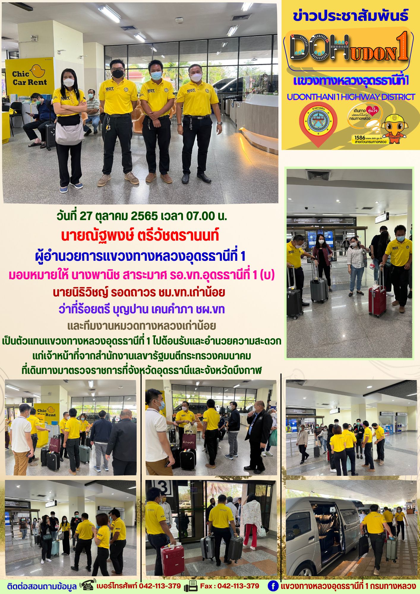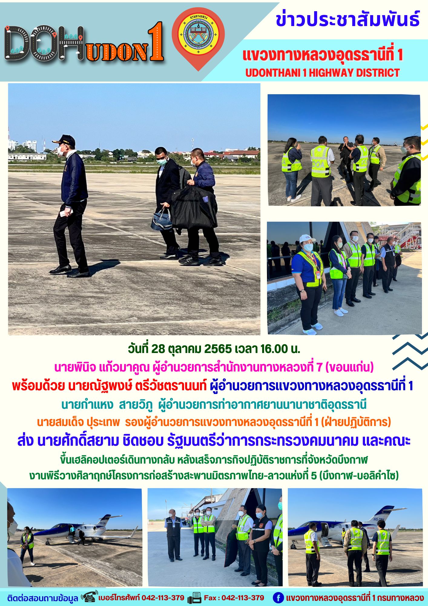 นายณัฐพงษ์ ตรีวัชตรานนท์ ผู้อำนวยการแขวงทางหลวงอุดรธานีที่ 1 มอบหมายให้ นายสมเด็จ ปุระเทพ รอ.ขท.อุดรธานีที่ 1 (ป) นายศุภชัย ศรีโยธี รอ.ขท.อุดรธานีที่ 1 (ว) พร้อมด้วยหัวหน้าหมวดทางหลวง หัวหน้างาน และเจ้าหน้าที่ในสังกัด เป็นตัวแทนแขวงทางหลวงอุดรธานีที่ 1 ต้อนรับคณะเจ้าหน้าที่ สำนักบริหารโครงการทางหลวงระหว่างประเทศ ณ ท่าอากาศยานนานาชาติจังหวัดอุดรธานี เพื่อเดินทางไปพิธีวางศิลาฤกษ์โครงการก่อสร้างสะพานมิตรภาพไทย-ลาวแห่งที่ 5 (บึงกาฬ-บอลิคำไซ)