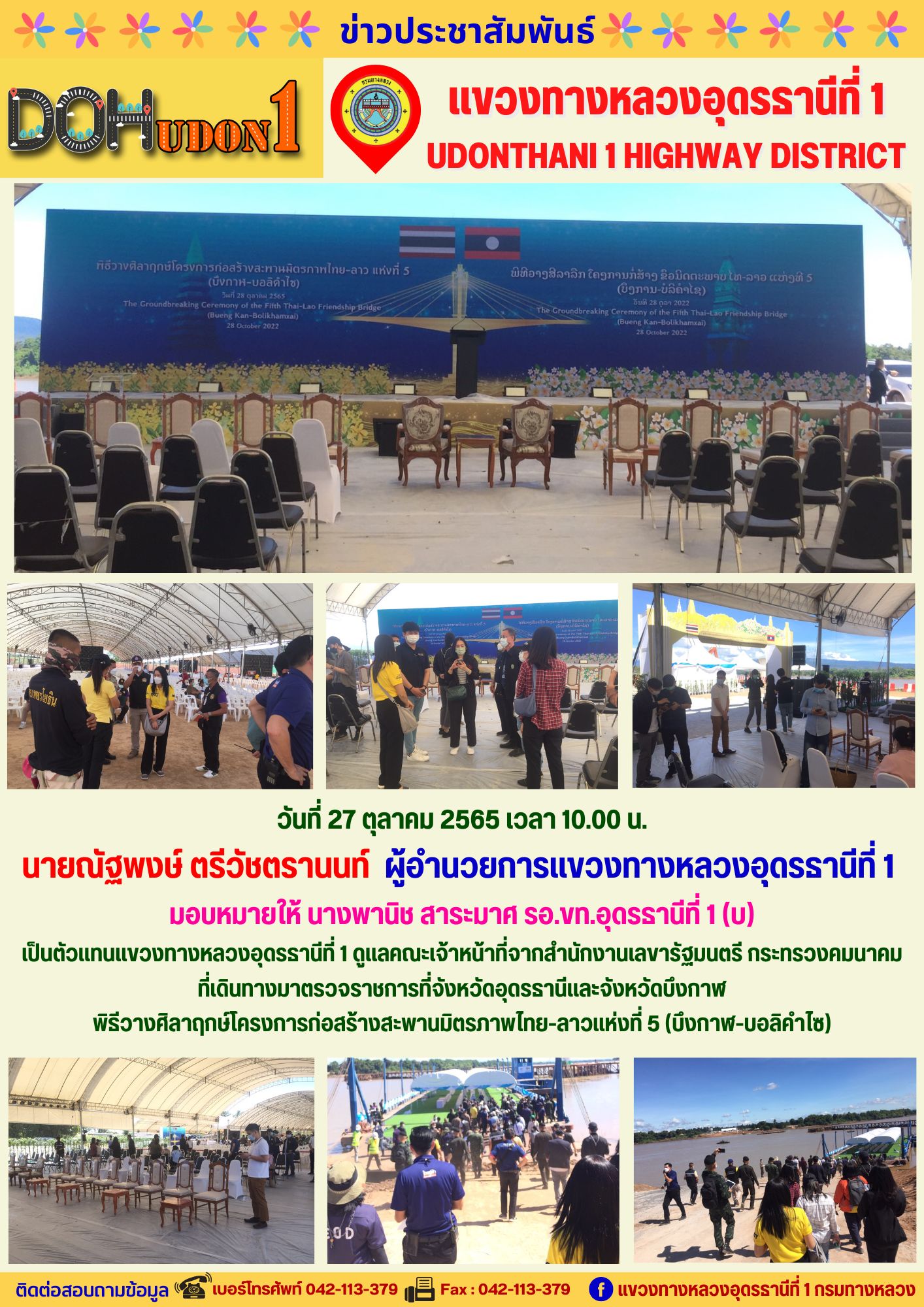 นายณัฐพงษ์ ตรีวัชตรานนท์ ผู้อำนวยการแขวงทางหลวงอุดรธานีที่ 1 มอบหมายให้ นางพานิช สาระมาศ รอ.ขท.อุดรธานีที่ 1 (บ) เป็นตัวแทนแขวงทางหลวงอุดรธานีที่ 1 ดูแลคณะเจ้าหน้าที่จากสำนักงานเลขารัฐมนตรี กระทรวงคมนาคม ที่เดินทางมาตรวจราชการที่จังหวัดอุดรธานีและจังหวัดบึงกาฬ พิธีวางศิลาฤกษ์โครงการก่อสร้างสะพานมิตรภาพไทย-ลาวแห่งที่ 5 (บึงกาฬ-บอลิคำไซ)
