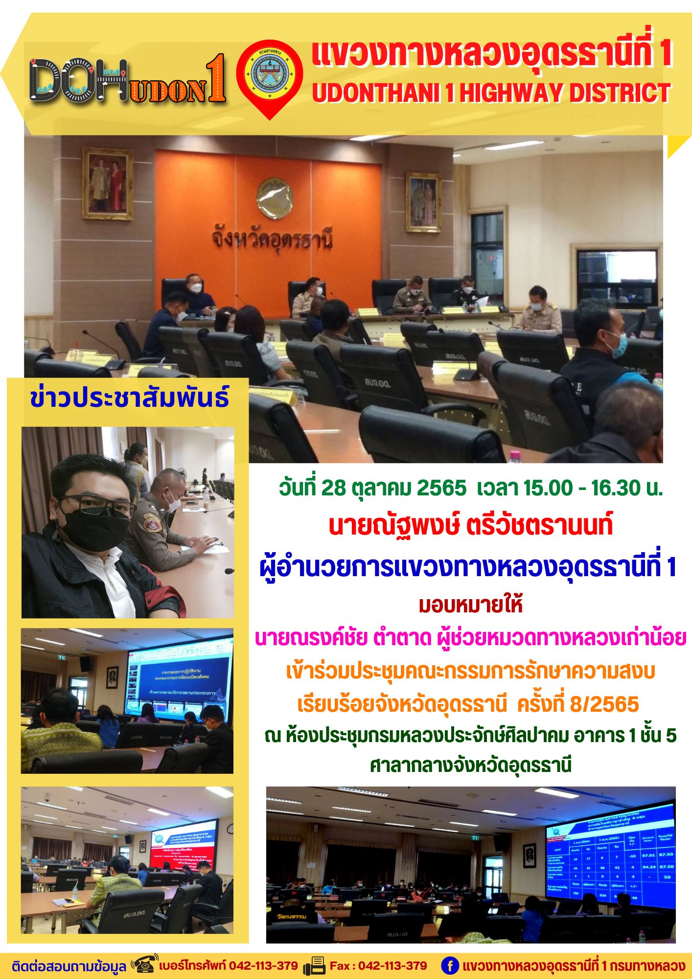 นายณัฐพงษ์ ตรีวัชตรานนท์ ผู้อำนวยการแขวงทางหลวงอุดรธานีที่ 1 มอบหมายให้ นายณรงค์ชัย ตำตาด ผู้ช่วยหมวดทางหลวงเก่าน้อย เข้าร่วมประชุมคณะกรรมการรักษาความสงบเรียบร้อยจังหวัดอุดรธานี ครั้งที่ 8/2565