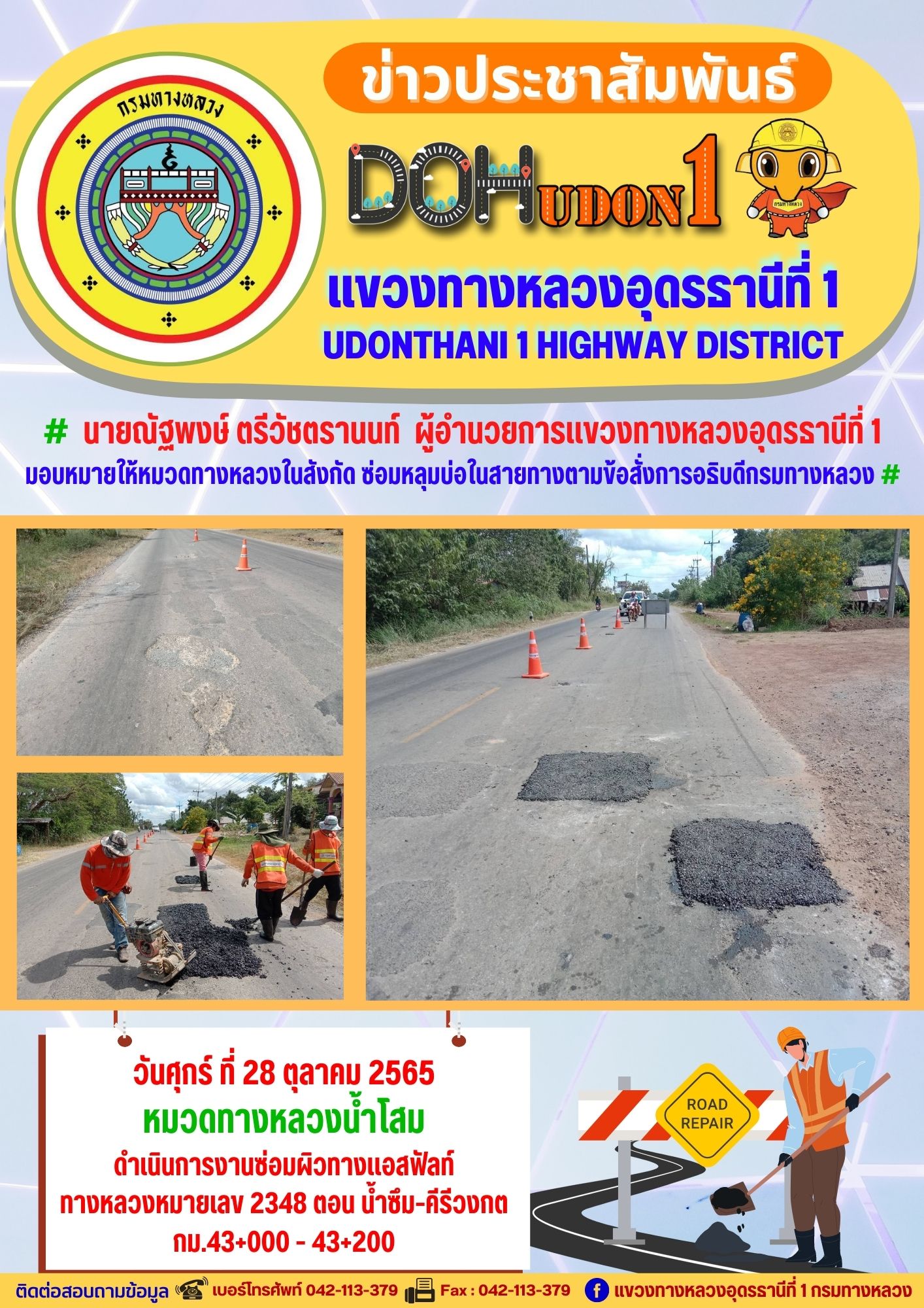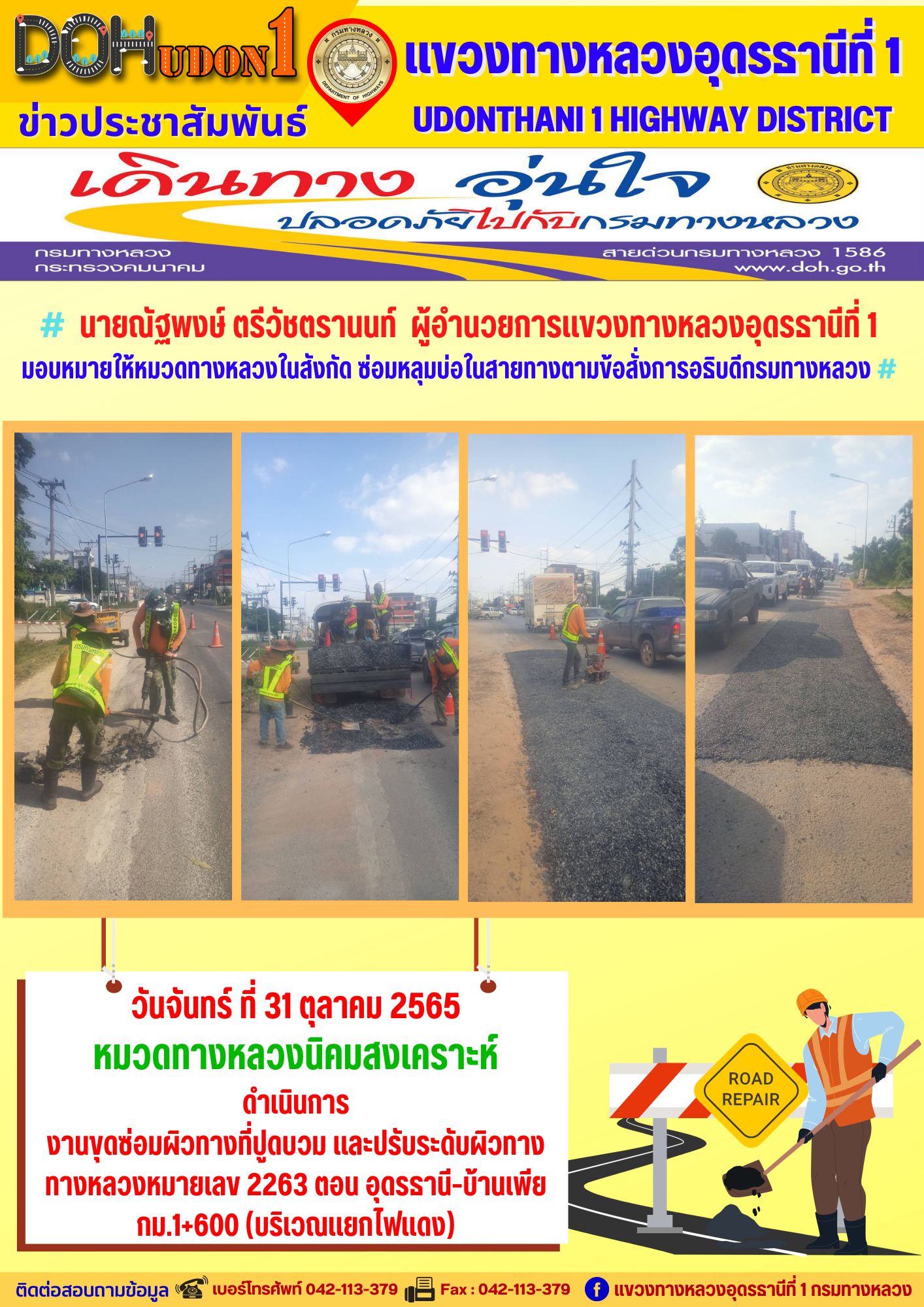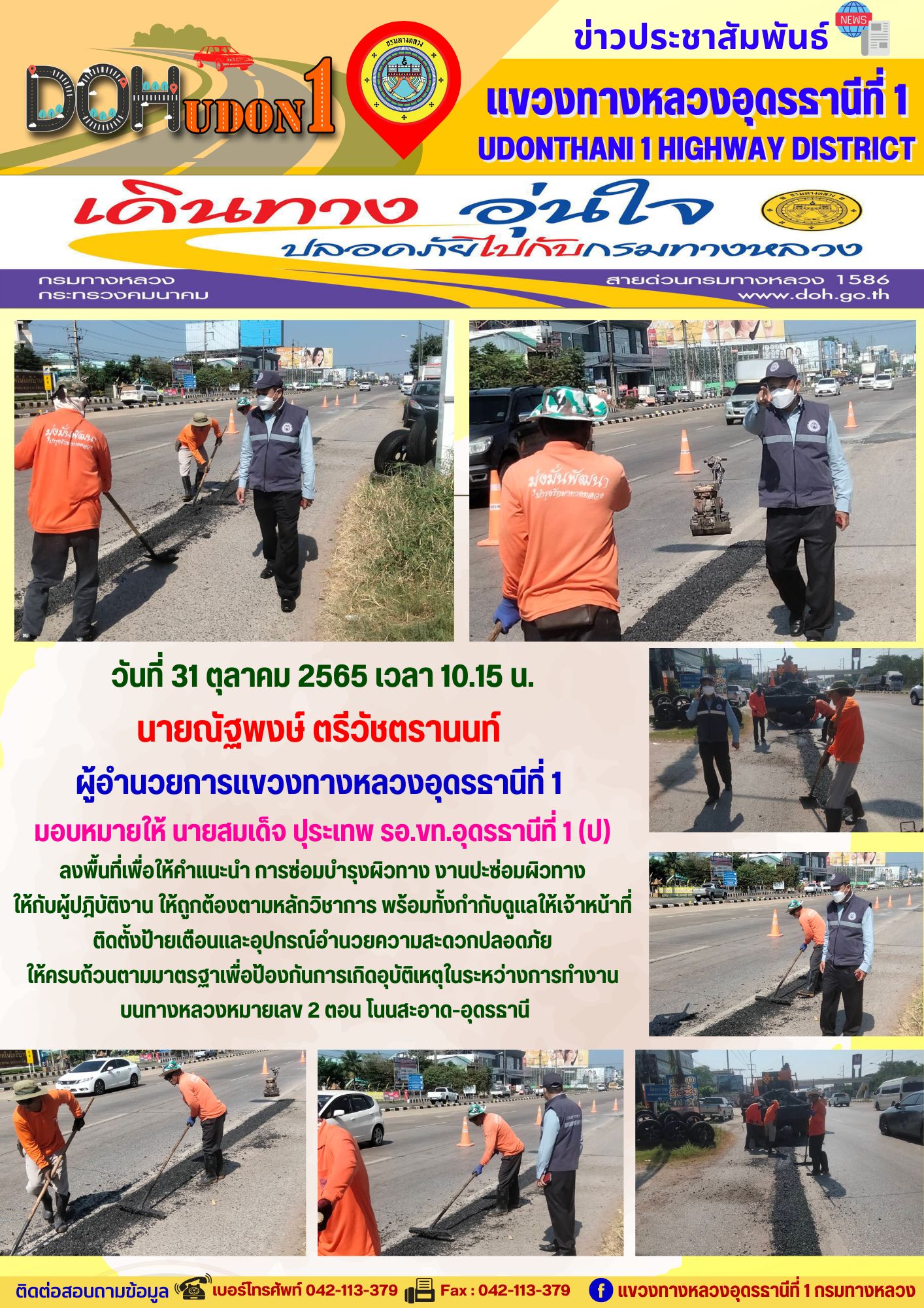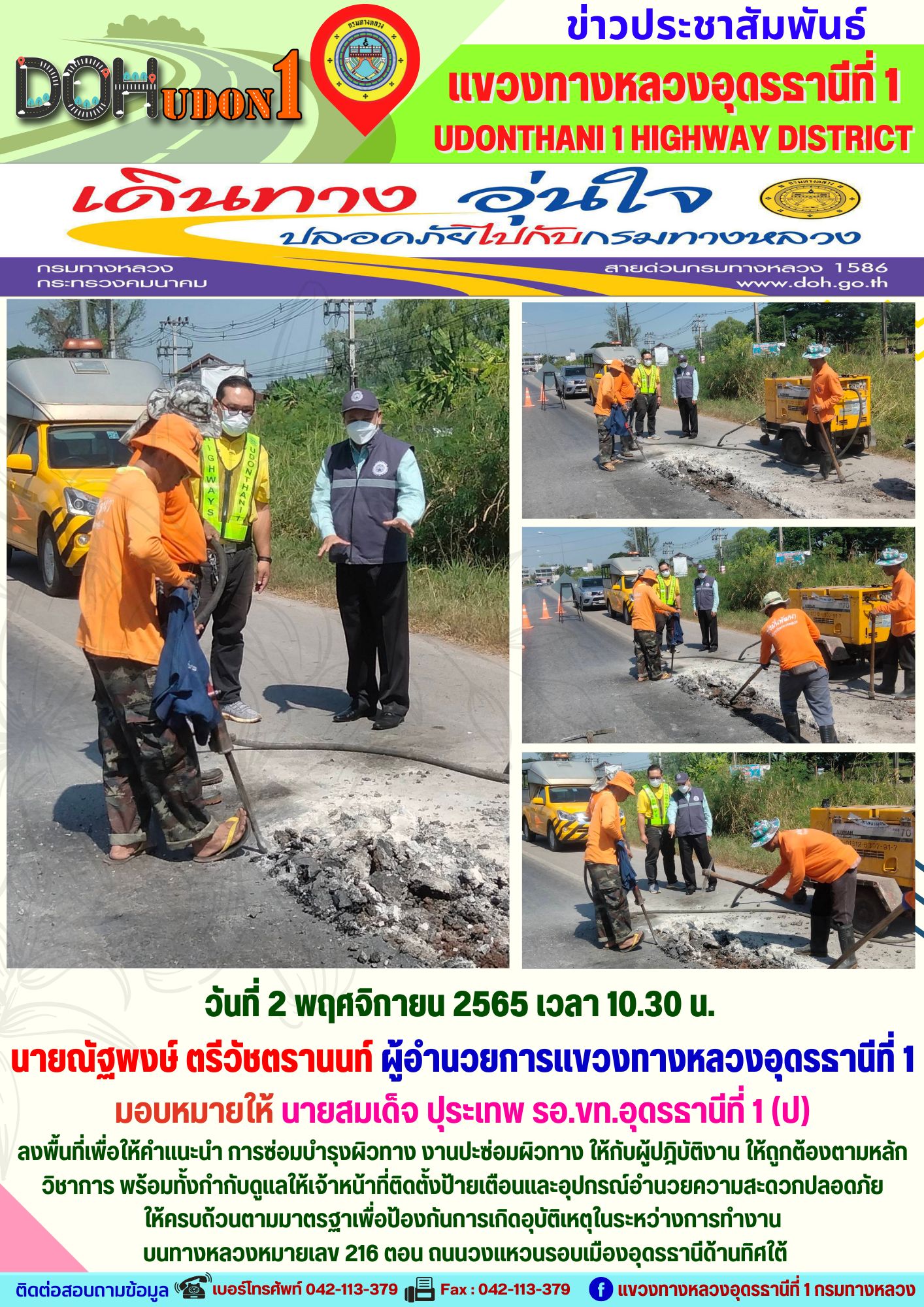 นายณัฐพงษ์ ตรีวัชตรานนท์ ผู้อำนวยการแขวงทางหลวงอุดรธานีที่ 1 มอบหมายให้ นายสมเด็จ ปุระเทพ รอ.ขท.อุดรธานีที่ 1 (ป) ลงพื้นที่เพื่อให้คำแนะนำ การซ่อมบำรุงผิวทาง งานปะซ่อมผิวทาง ให้กับผู้ปฎิบัติงาน