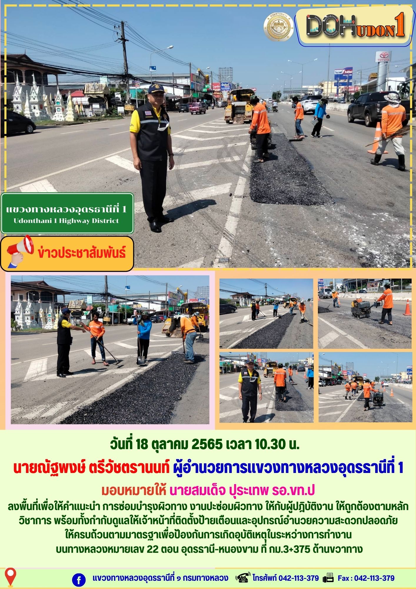 นายณัฐพงษ์ ตรีวัชตรานนท์ ผู้อำนวยการแขวงทางหลวงอุดรธานีที่ 1 มอบหมายให้หมวดทางหลวงในสังกัด ซ่อมหลุมบ่อในสายทางตามข้อสั่งการอธิบดีกรมทางหลวง