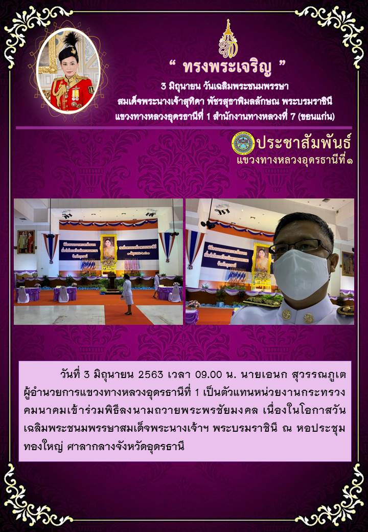 แขวงทางหลวงอุดรธานีที่ 1 ดำเนินการประดับพระฉายาลักษณ์และติดตั้งป้ายคัทเอาท์ถวายพระพรชัยมงคล เนื่องในโอกาสวันเฉลิมพระชนมพรรษาสมเด็จพระนางเจ้าสุทิดา พัชรสุธาพิมลลักษณ พระบรมราชินี วันที่ 3 มิถุนายน 2563