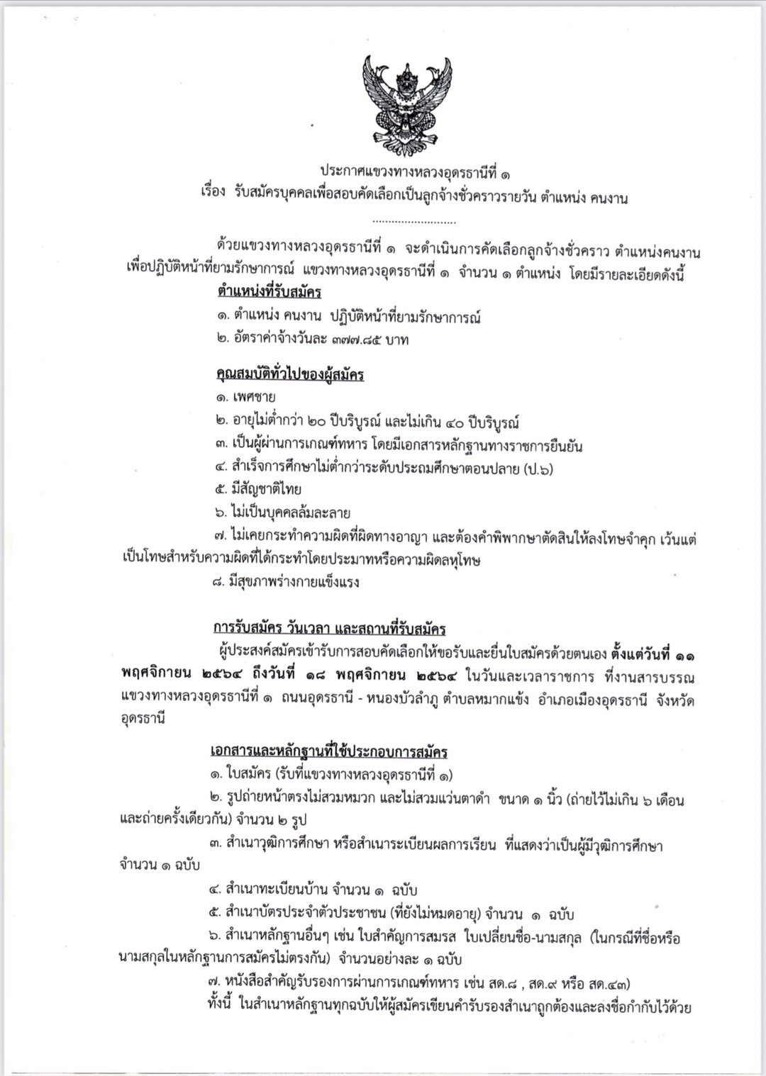 เพื่อปฏิบัติหน้าที่ยามรักษาการณ์ แขวงทางหลวงอุดรธานีที่ ๑ จำนวน ๑ ตำแหน่ง โดยมีรายละเอียดดังนี้