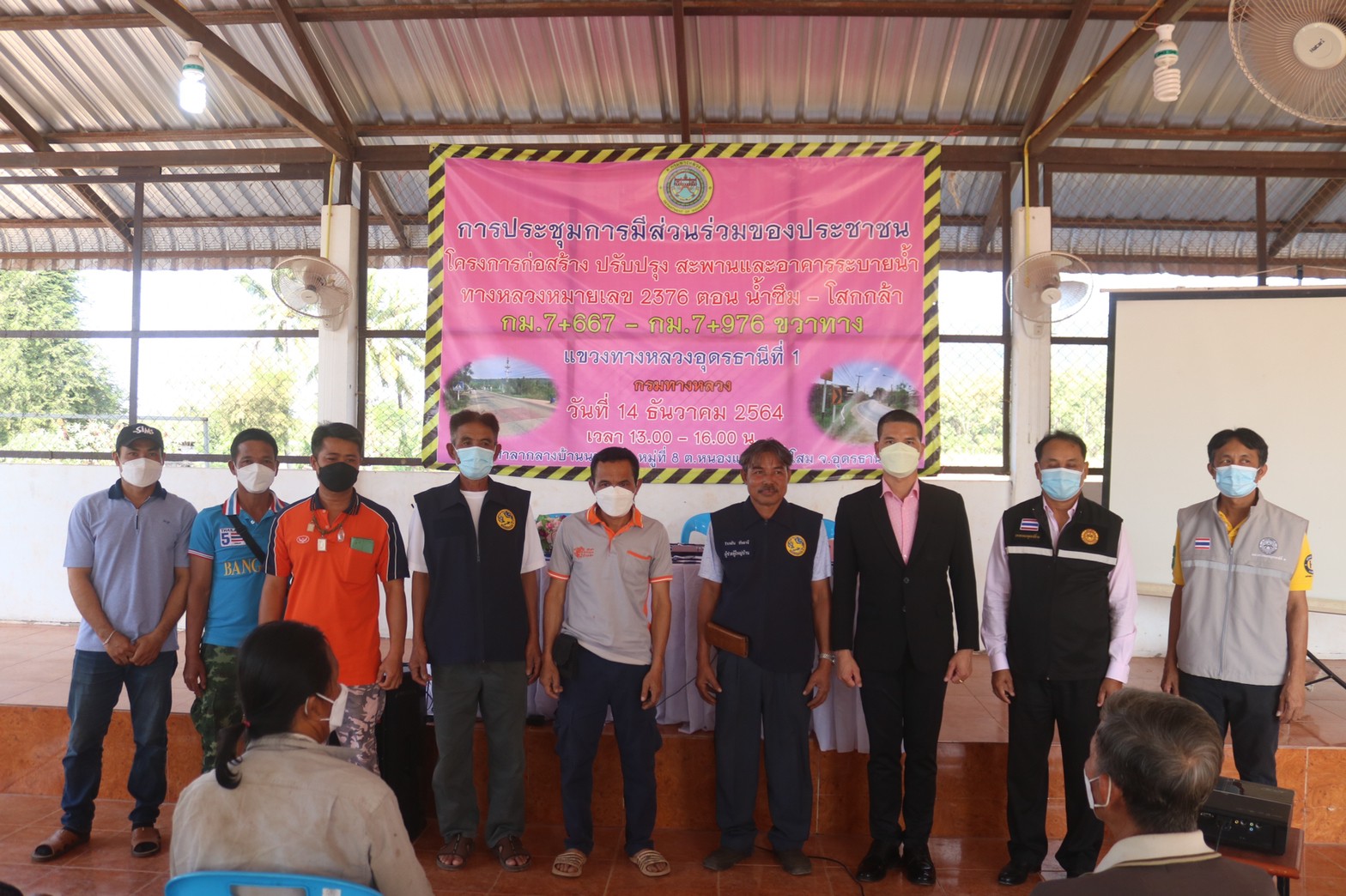วันที่ 14 ธันวาคม 2564 เวลา 13.00 น. แขวงทางหลวงอุดรธานีที่ 1 ดำเนินการจัดการประชุมการมีส่วนร่วมของประชาชน โครงการก่อสร้าง ปรับปรุง สะพานและอาคารระบายน้ำ ทางหลวงหมายเลข 2376 ตอน น้ำซึม-โสกกล้า กม.7+667 -กม.7+976 ด้านขวาทาง ณ ศาลากลางบ้านนาเก็น ต.หนองแวง อ.น้ำโสม จ.อุดรธานี โดยมี พ.อ.อ.อุเทน จามน้อยพรหม ปลัดองค์การบริหารส่วนตำบลหนองแวง เป็นประธานในพิธี วิทยากรบรรยายโครงการโดย นายสมเด็จ ปุระเทพ รอ.ขท.(ป) และนายวัชรพงษ์ ปลัดศรีช่วย หัวหน้าหมวดทางหลวงน้ำโสม ผู้เข้าร่วมประชุมเป็นผู้เกี่ยวข้องและมีส่วนได้เสียในพื้นที่ก่อสร้าง ประมาณ 100 คน